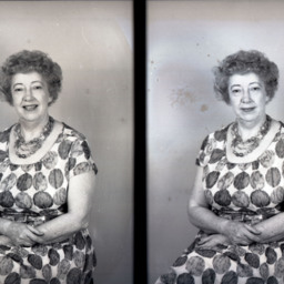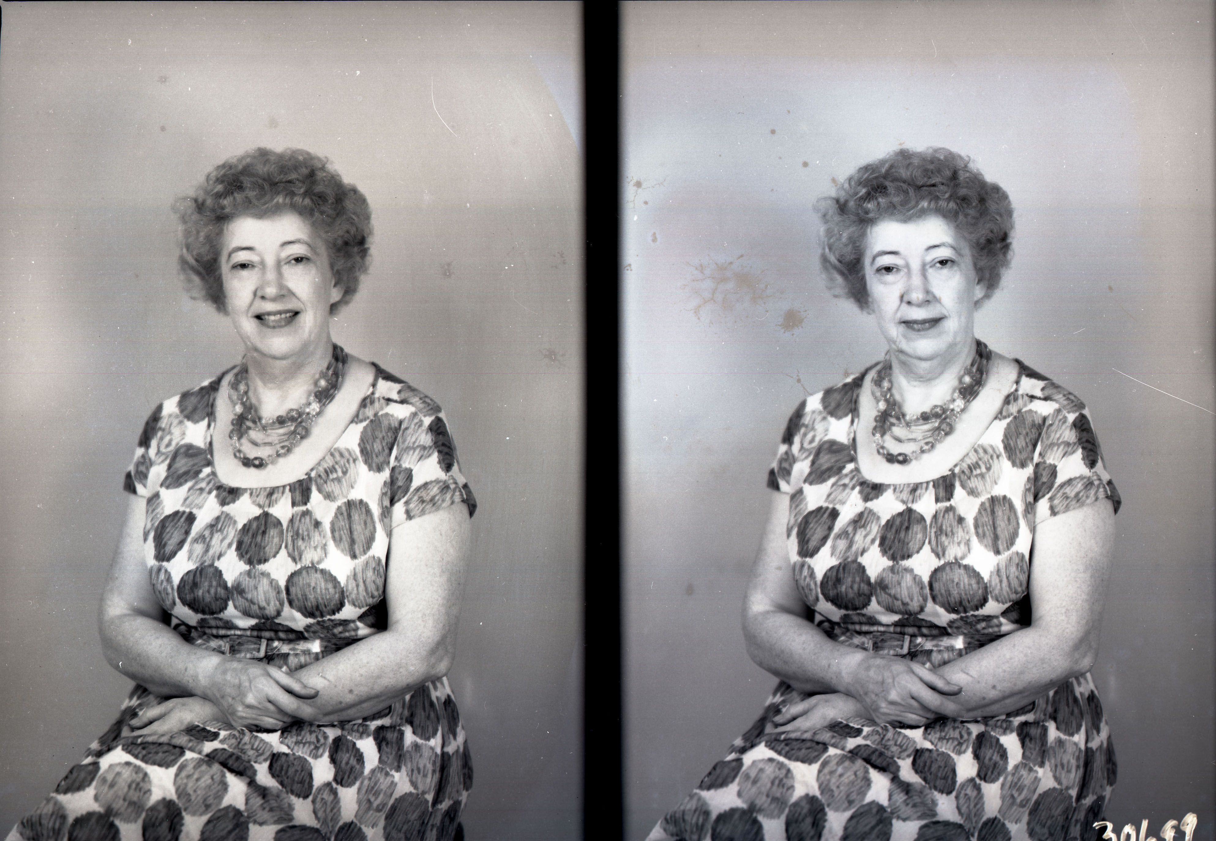 Photo of two separate photographs of the same unidentified woman with short, curly hair and wearing a bead necklace with her short-sleeved, print dress.