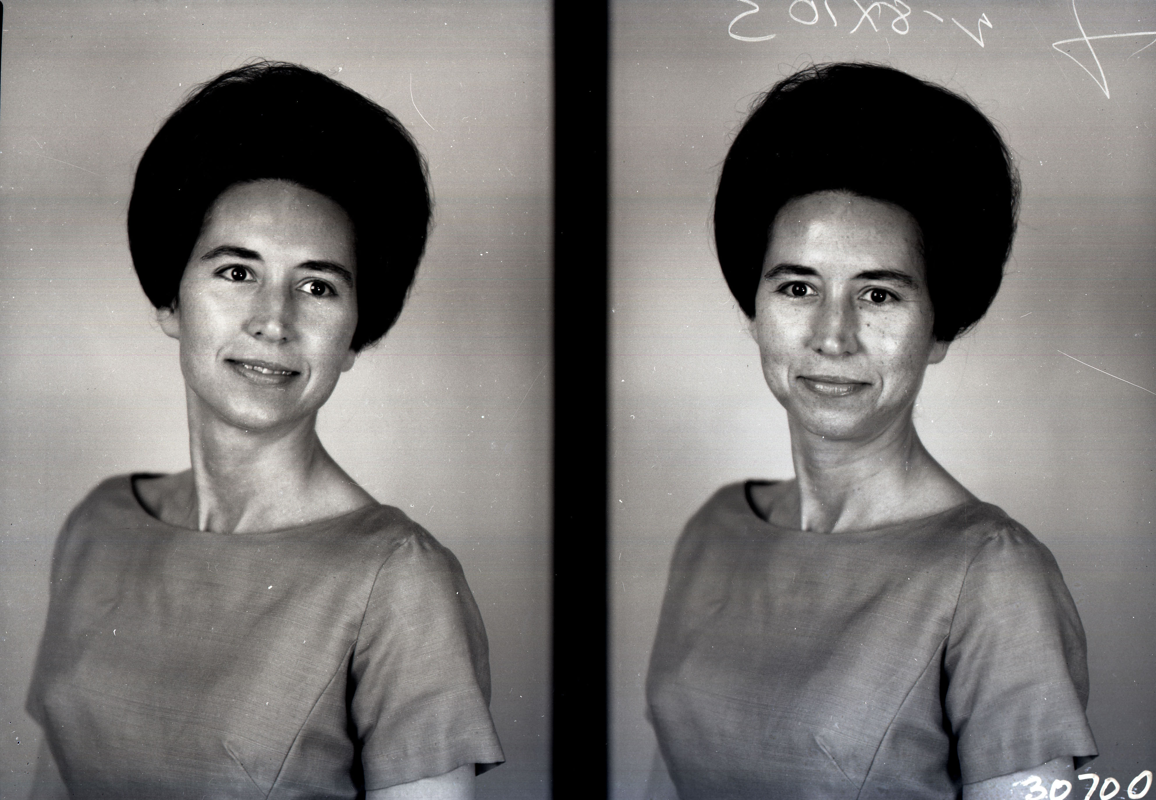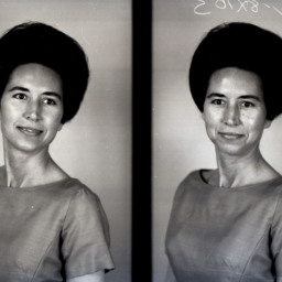 Photo of two separate portrait photographs of the same unidentified woman with short hair and wearing a short-sleeved dress.