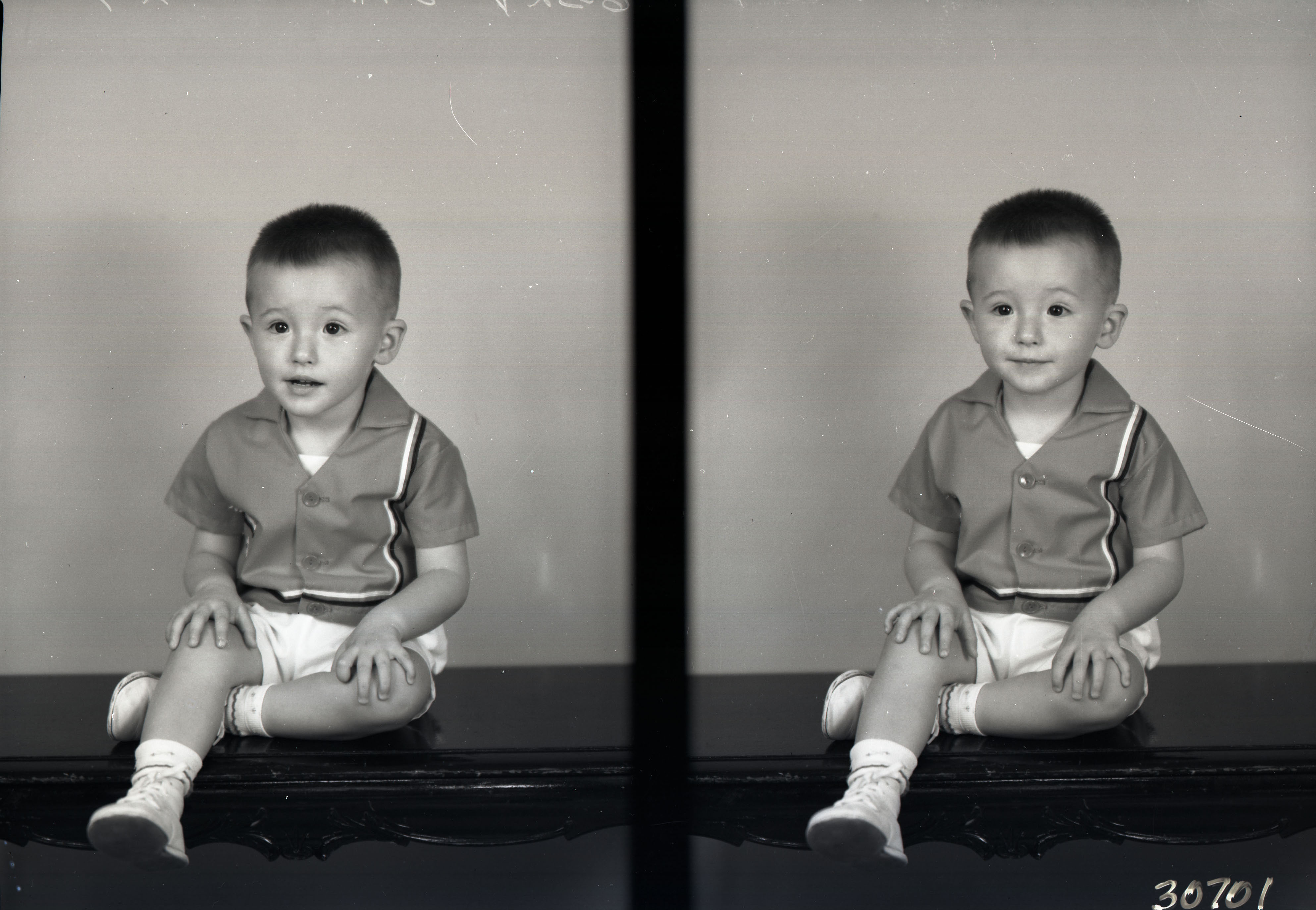 Photo of two separate photographs of the same unidentified toddler seated on a bench with one leg under the other.