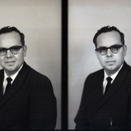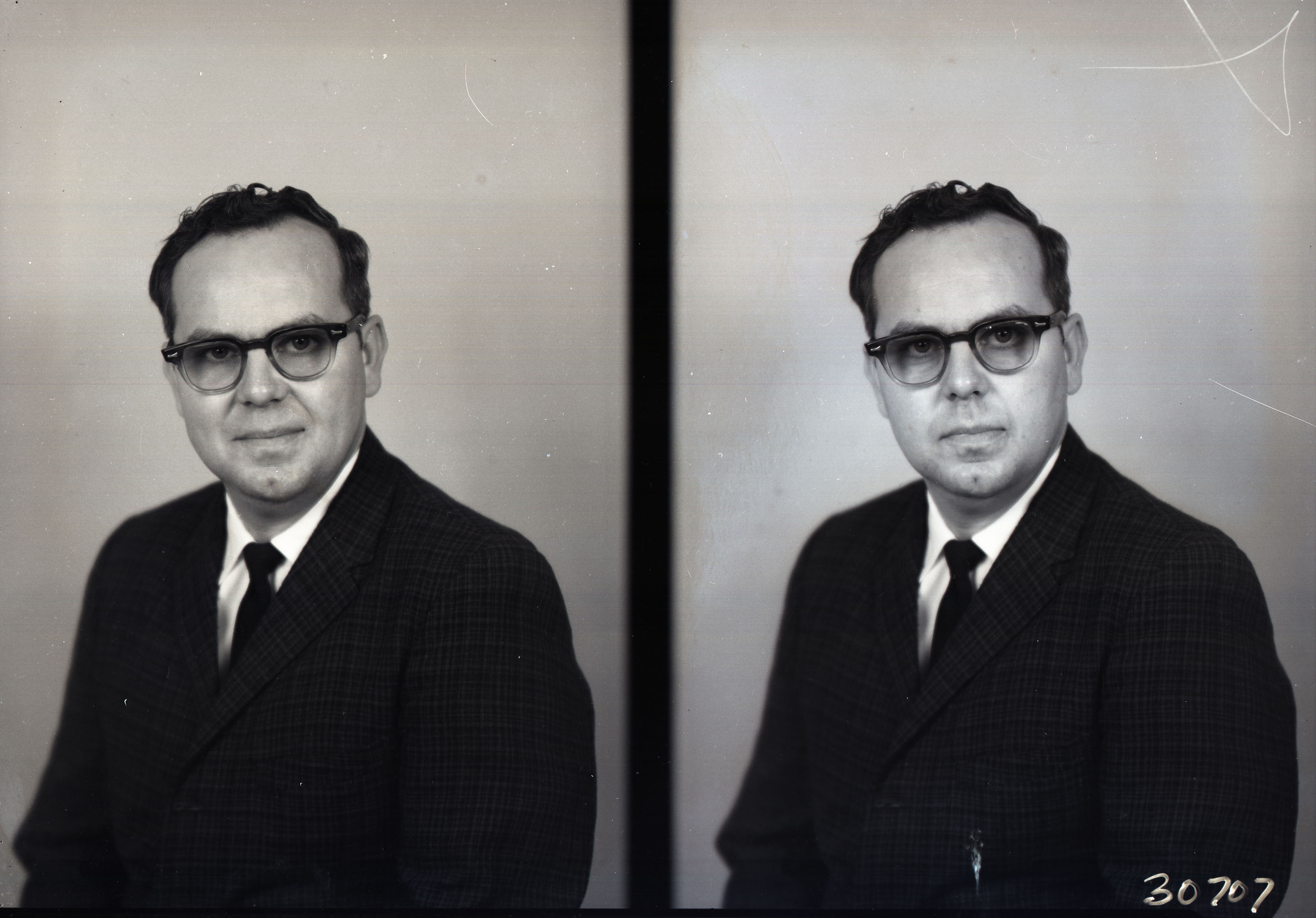 Photo of two separate portrait photographs of the same unidentified man with glasses and wearing a suit and tie.
