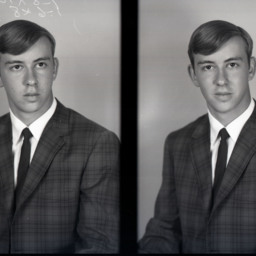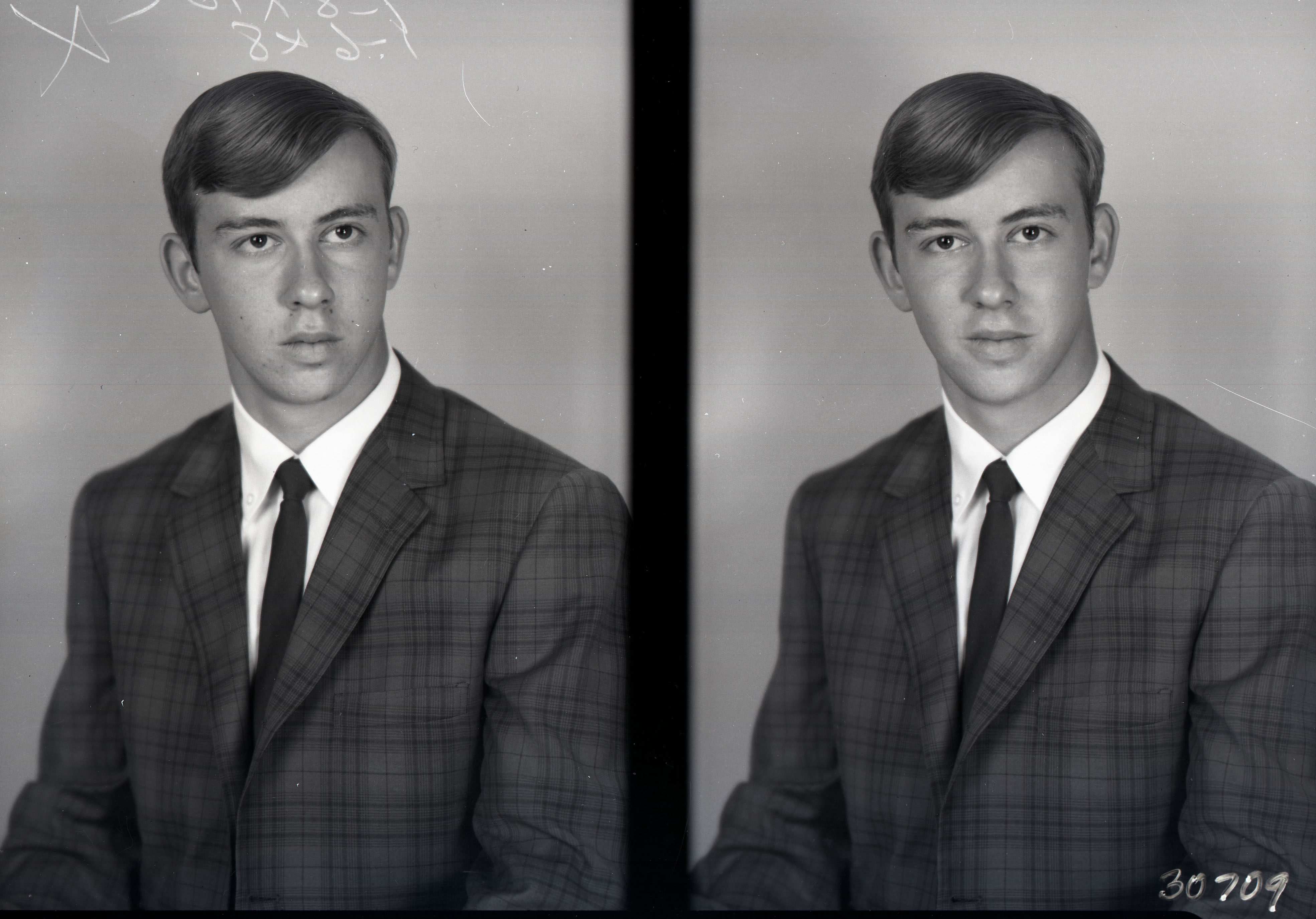 Photo of two separate portrait photographs of the same unidentified young man in a plaid suit jacket and tie.