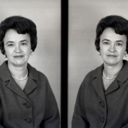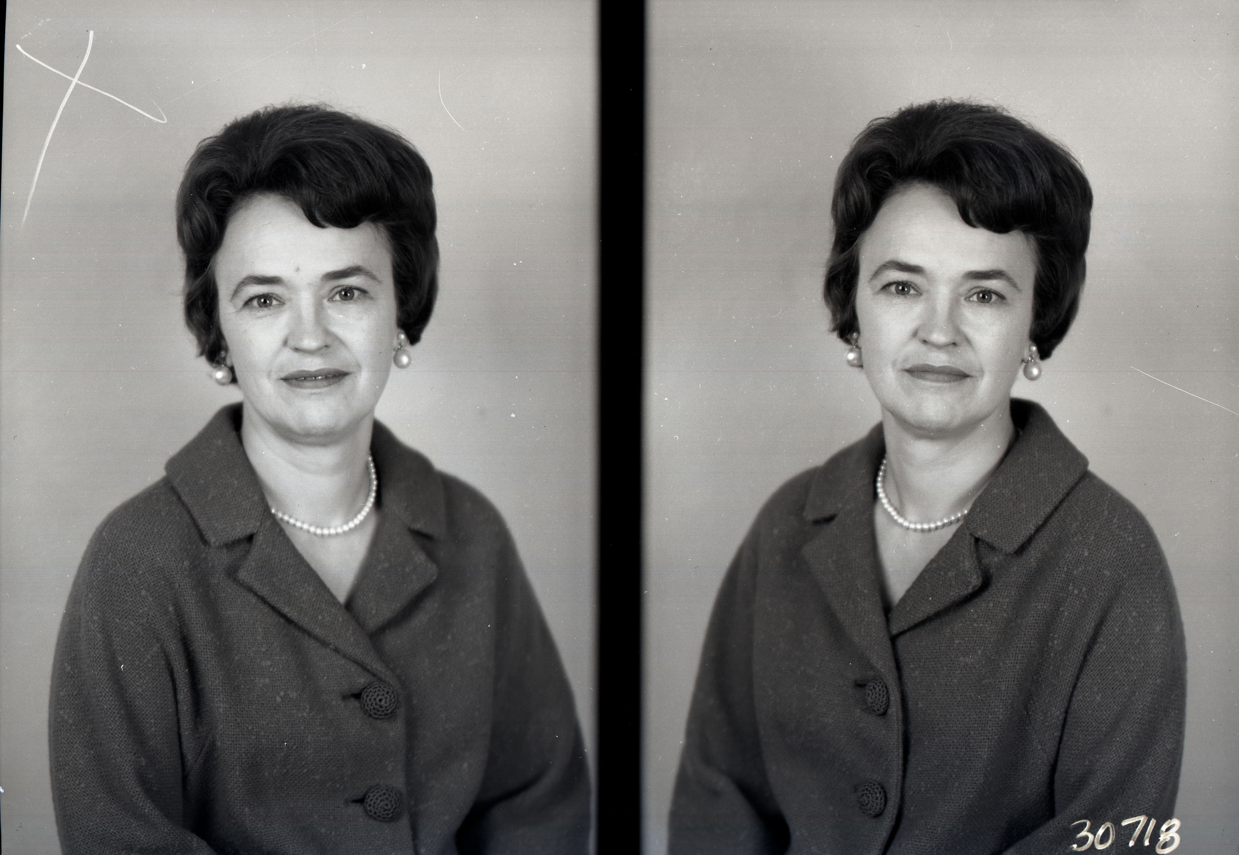 Photo of two separate portrait photographs of the same unidentified woman with short styled hair and wearing earrings and a faux pearl necklace with her dress.