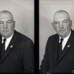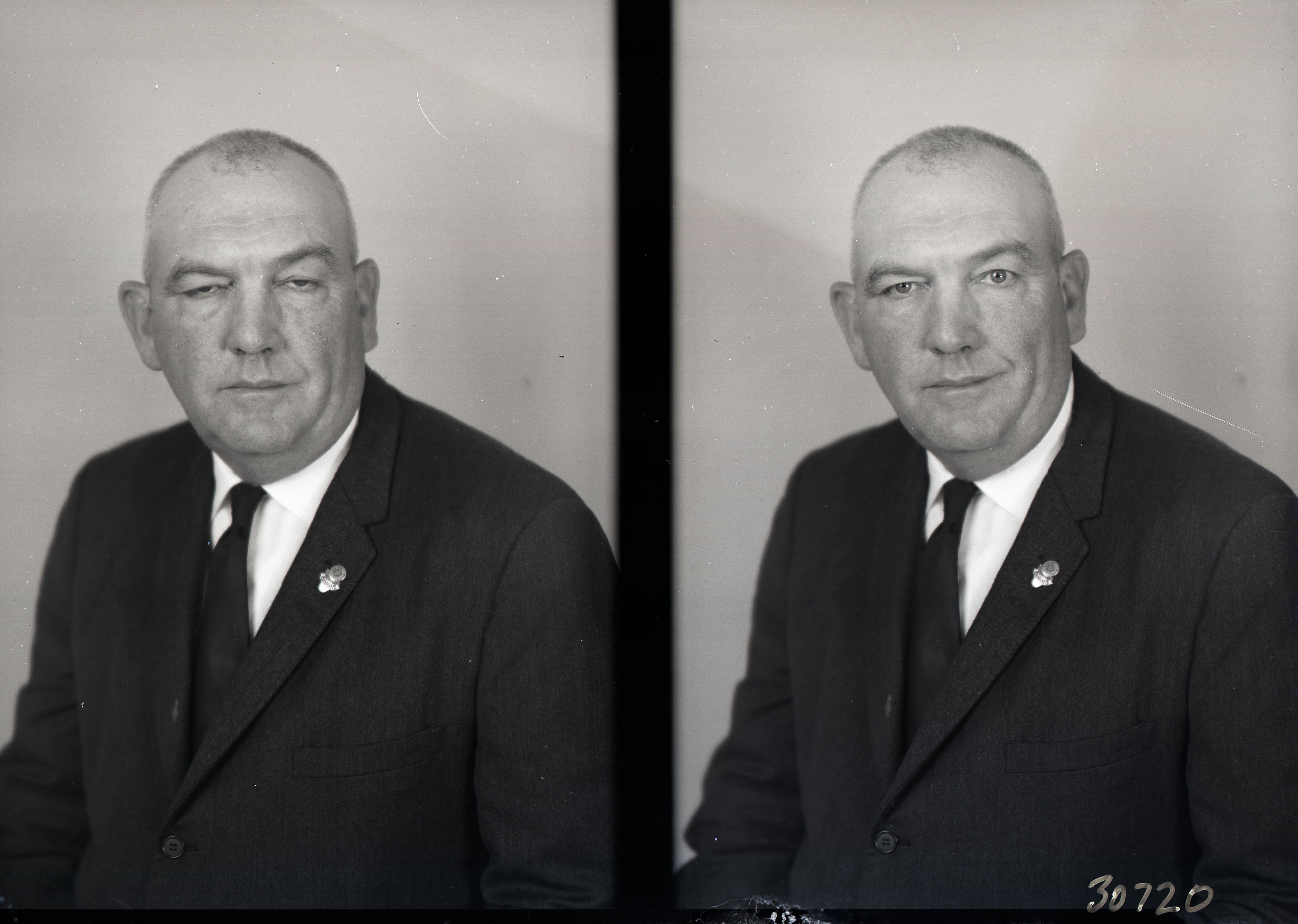 Photo of two separate portrait photographs of the same unidentified man wearing a suit and tie with a pin on his lapel.