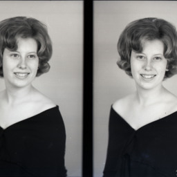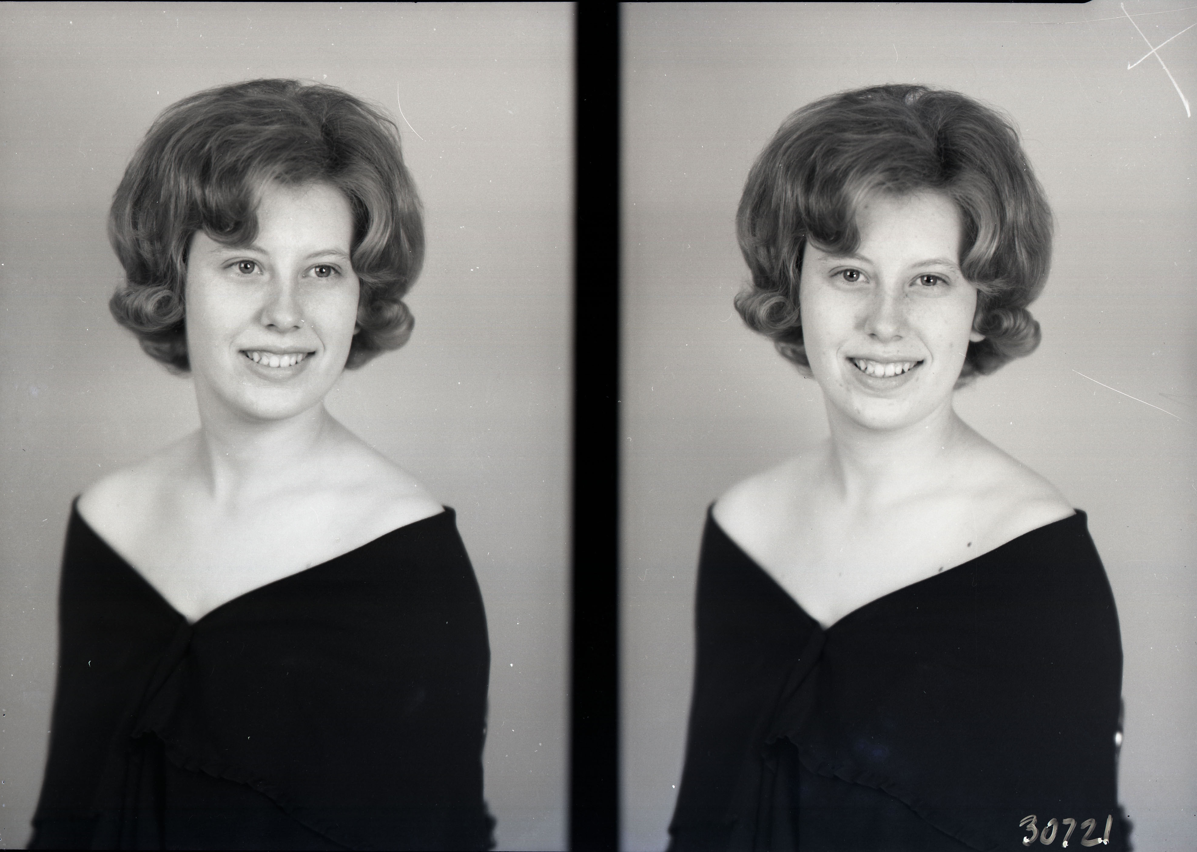 Photo of two separate portrait photographs of the same unidentified young woman with short, curled hair.