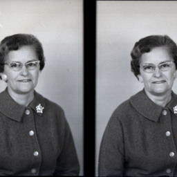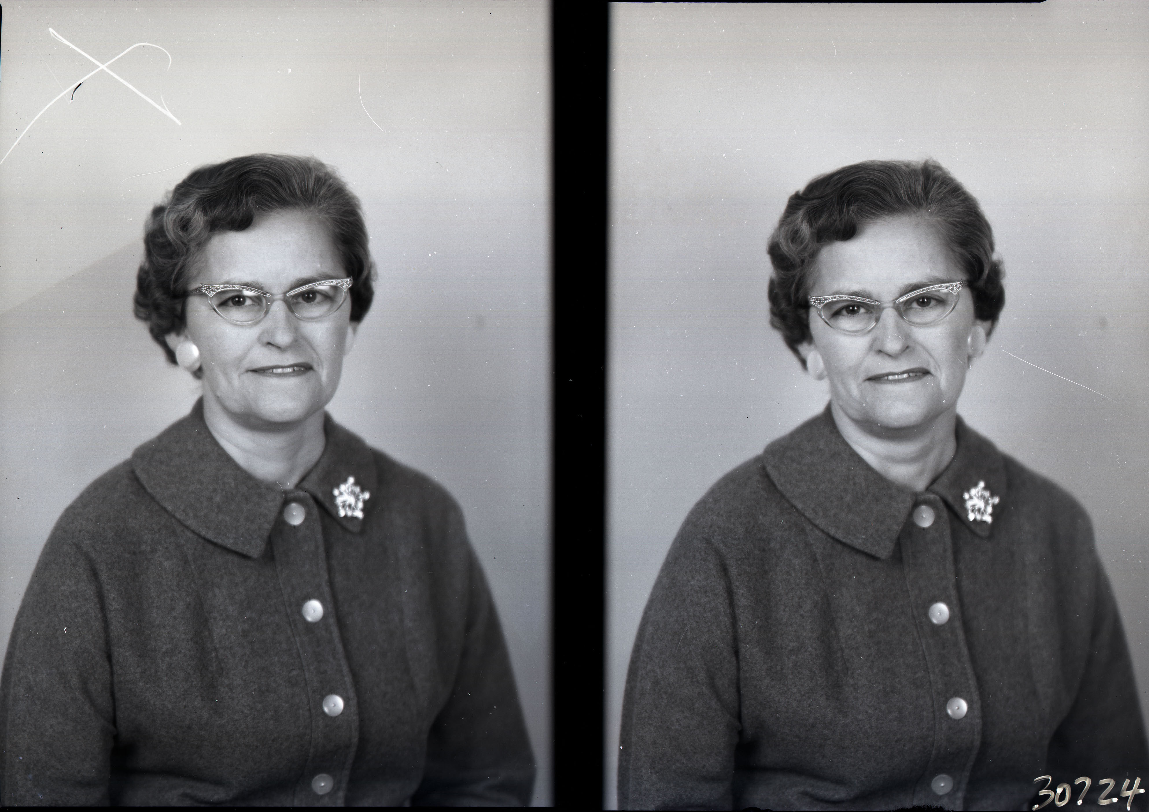 Photo of two separate portrait photographs of the same unidentified, older woman with glasses, short styled hair and wearing earrings and a pin on her collar.