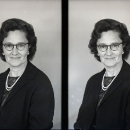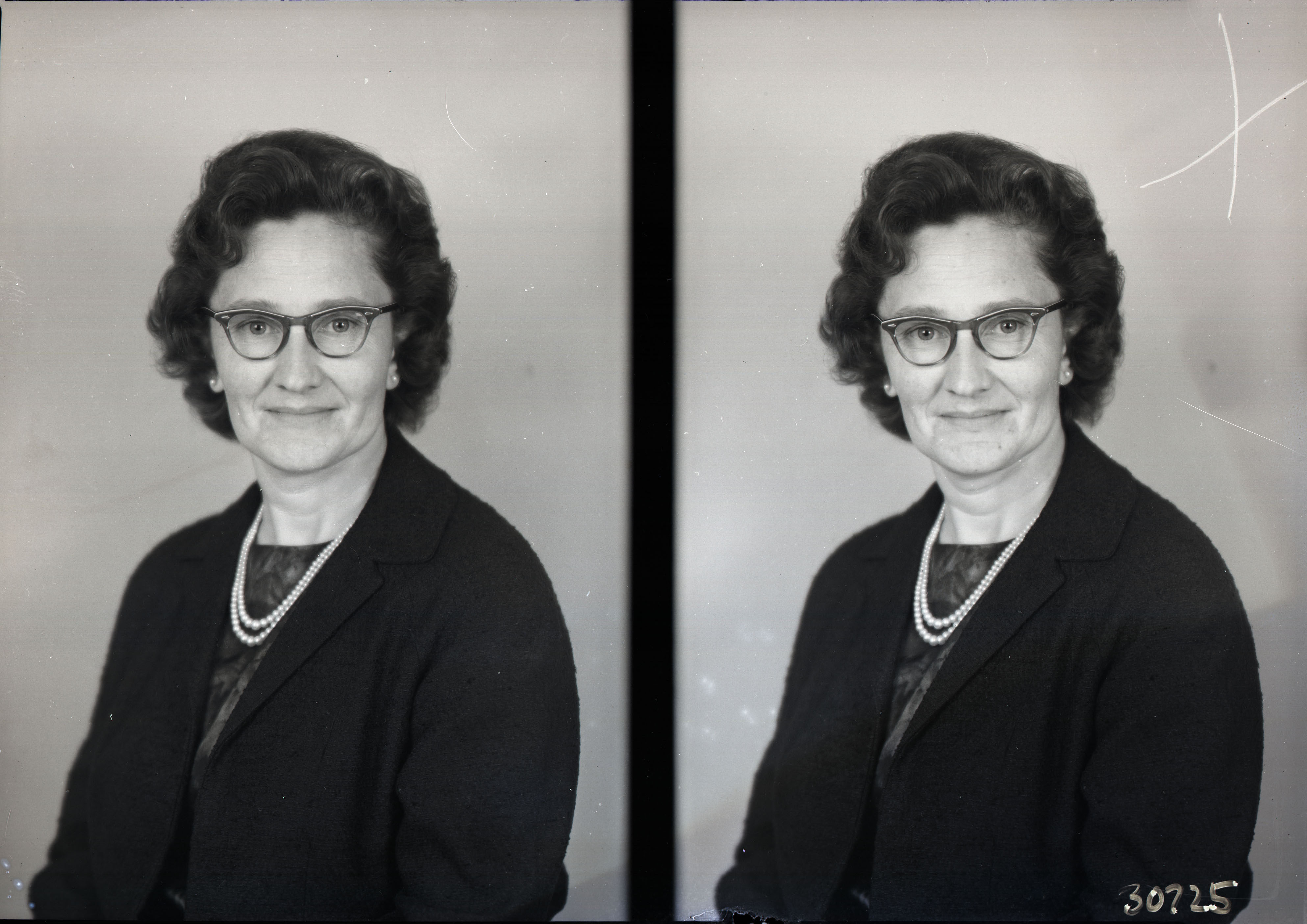 Photo of two separate portrait photographs of the same unidentified woman with glasses and wearing a necklace.