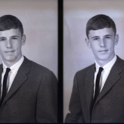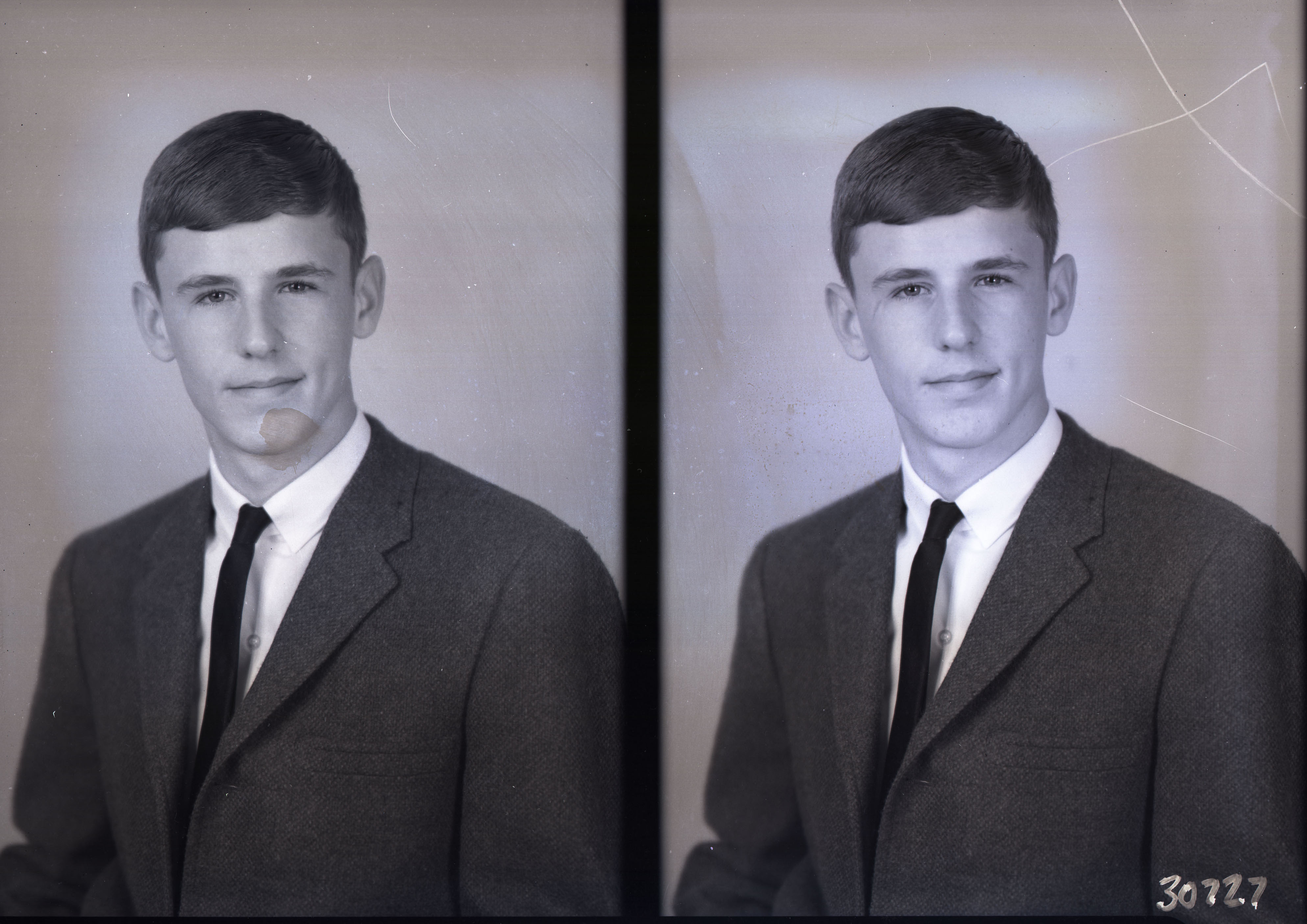 Photo of two separate portrait photographs of the same unidentified young man wearing a suit and tie.