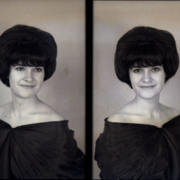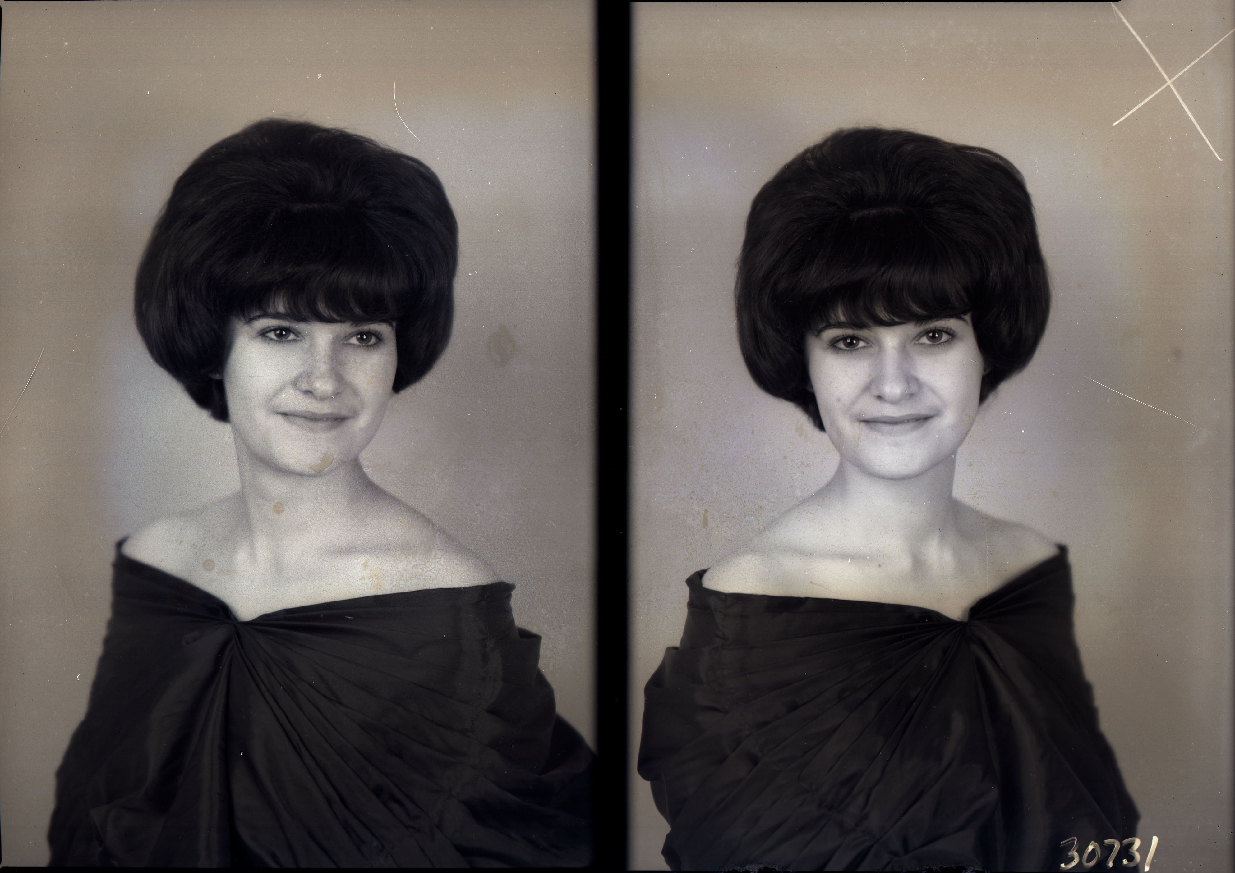 Photo of two separate portrait photographs of the same unidentified young woman with short hair and bangs.