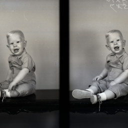 Photo of two separate photographs of the same unidentified young blond boy seated on a bench.