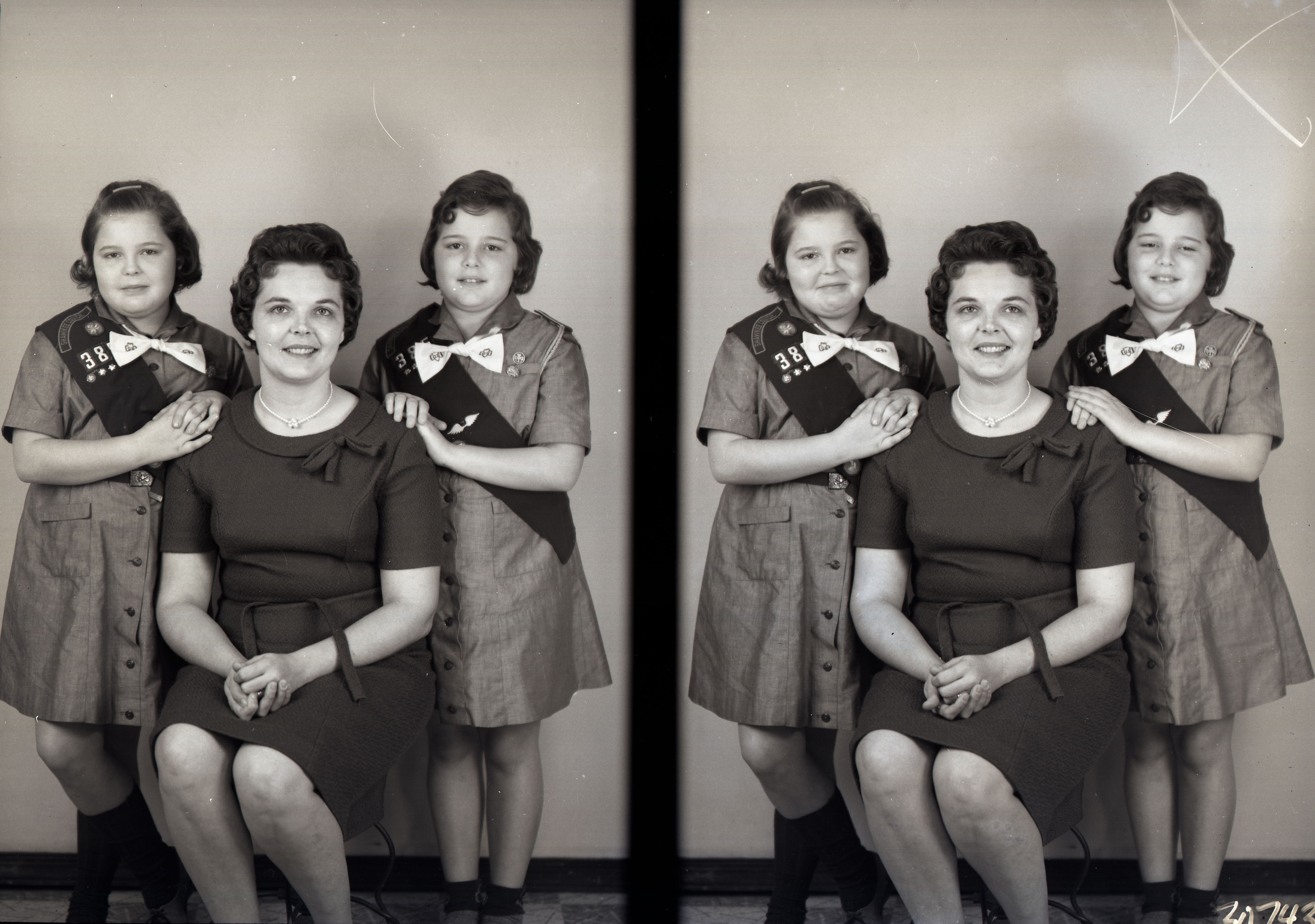 Photo of two separate photographs of an unidentified woman, seated, with an unidentified girl in a Girl Scout uniform posed on either side of her.