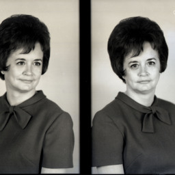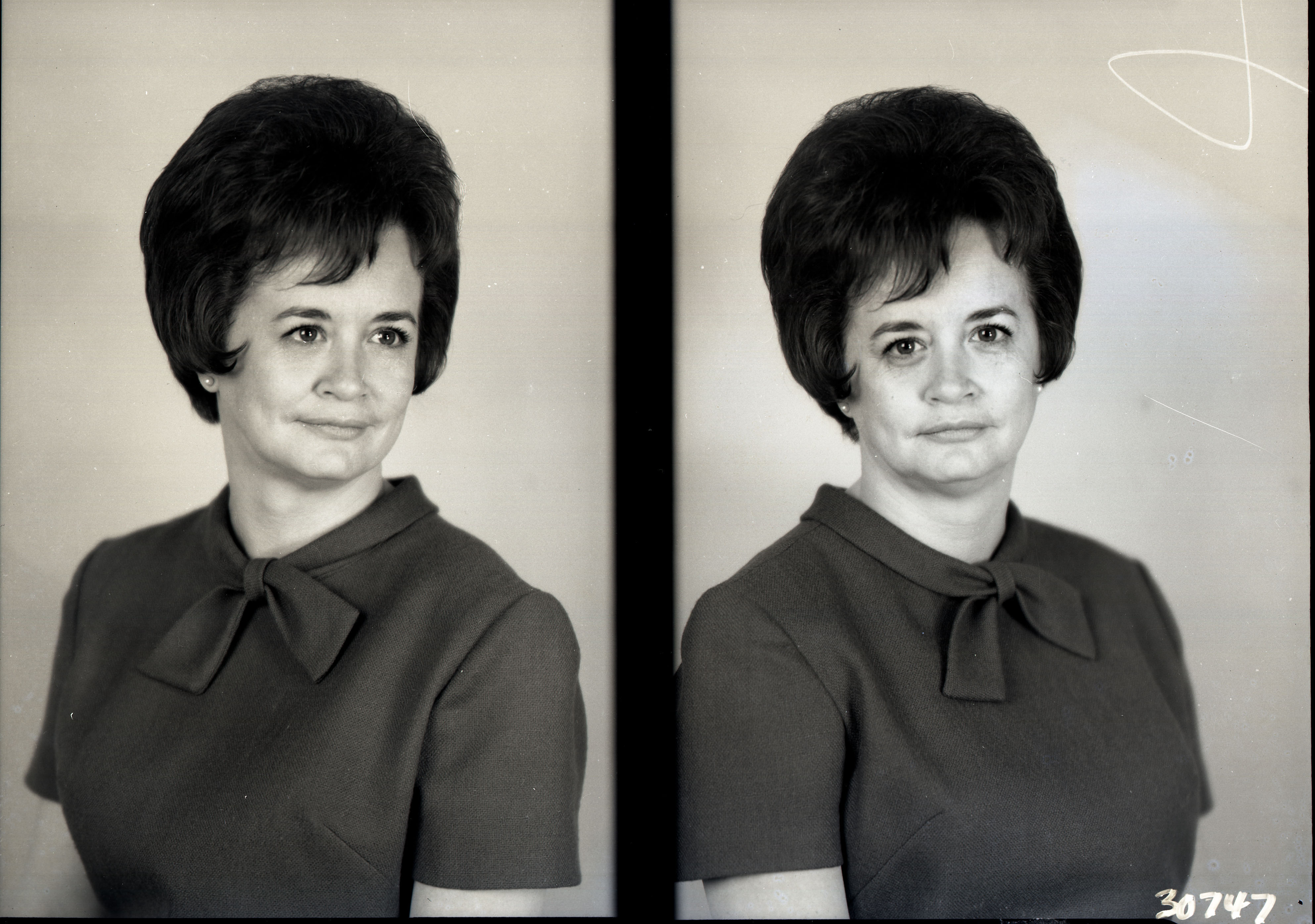 Photo of two separate portrait photographs of the same unidentified woman with short styled hair and wearing a bow on her collar.