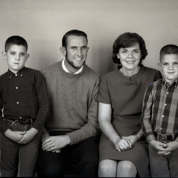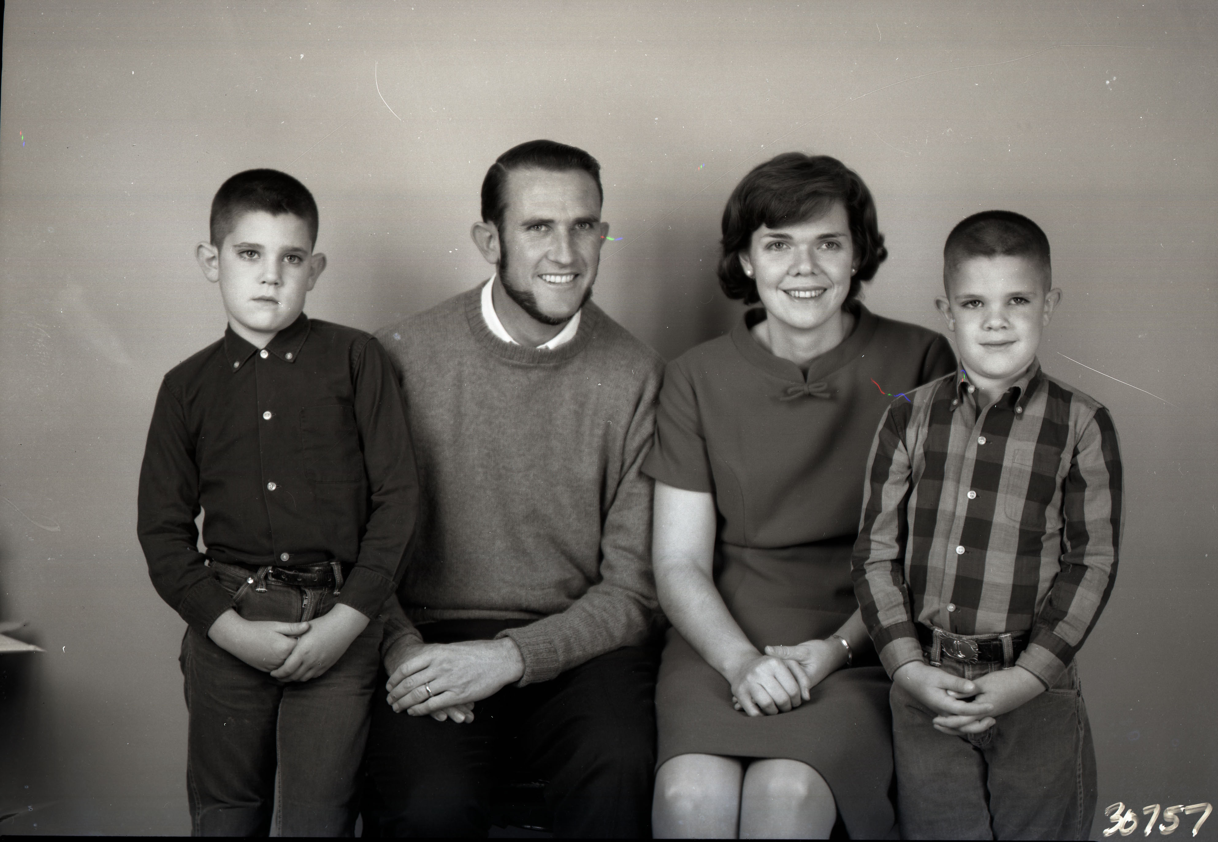 Unidentified man with a beard and woman are seated together with their two sons standing on either side of them.