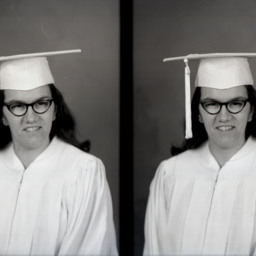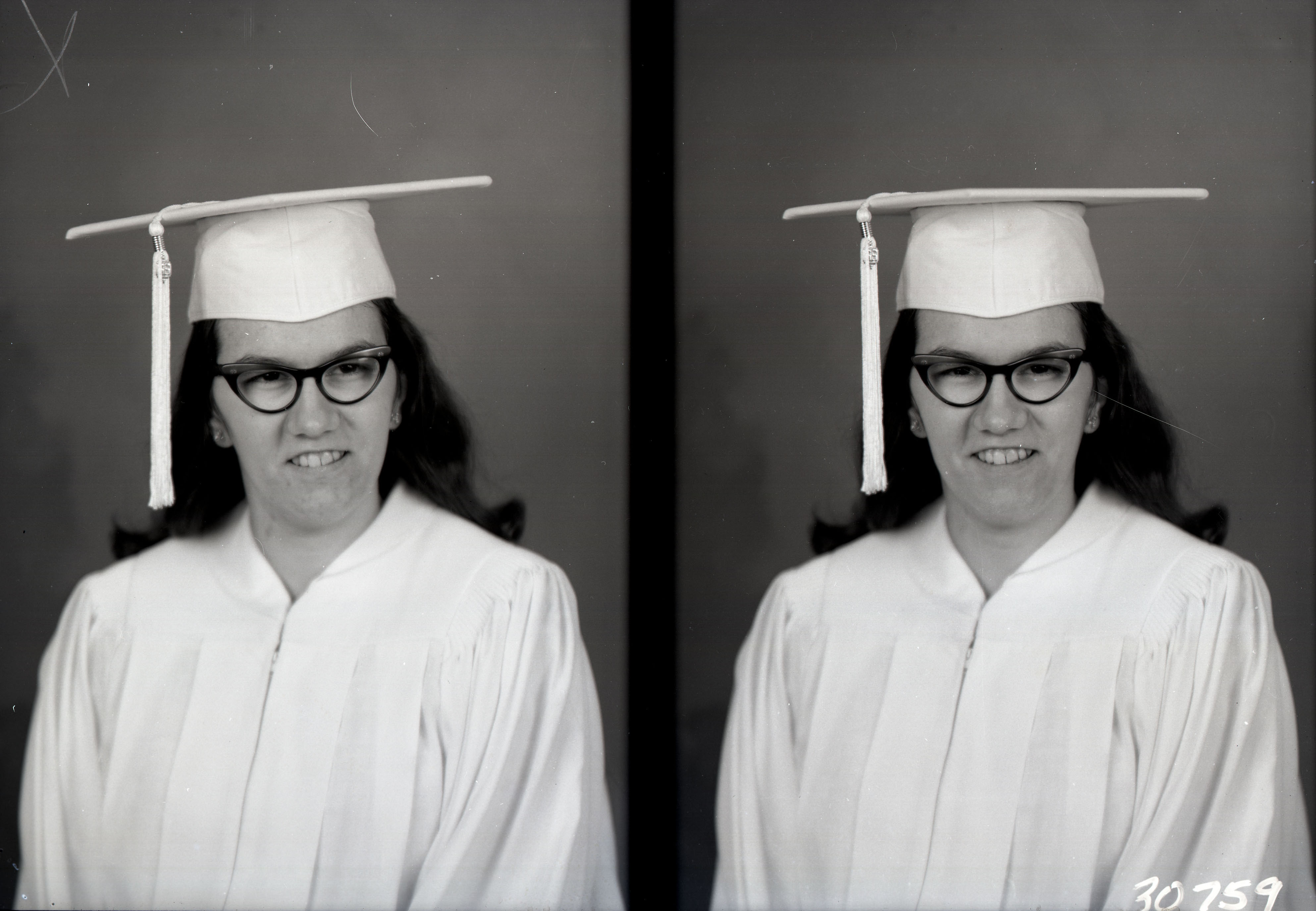 Photo of two separate portrait photographs of the same unidentified young woman in her graduation cap and gown.