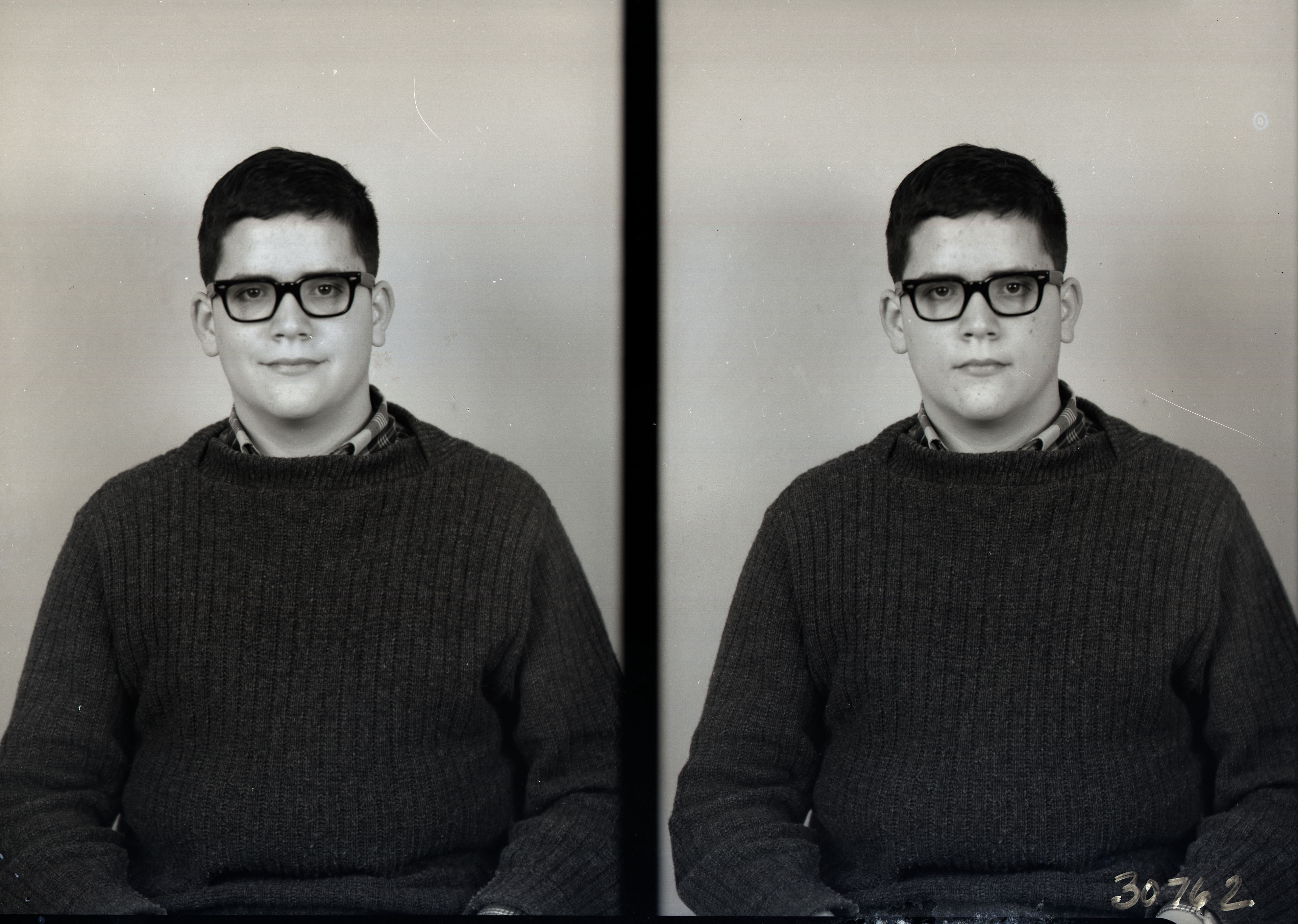Photo of two separate portrait photographs of Kline M. Wilkins as a teenaged boy with glasses and wearing a pullover sweater.