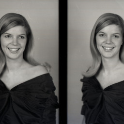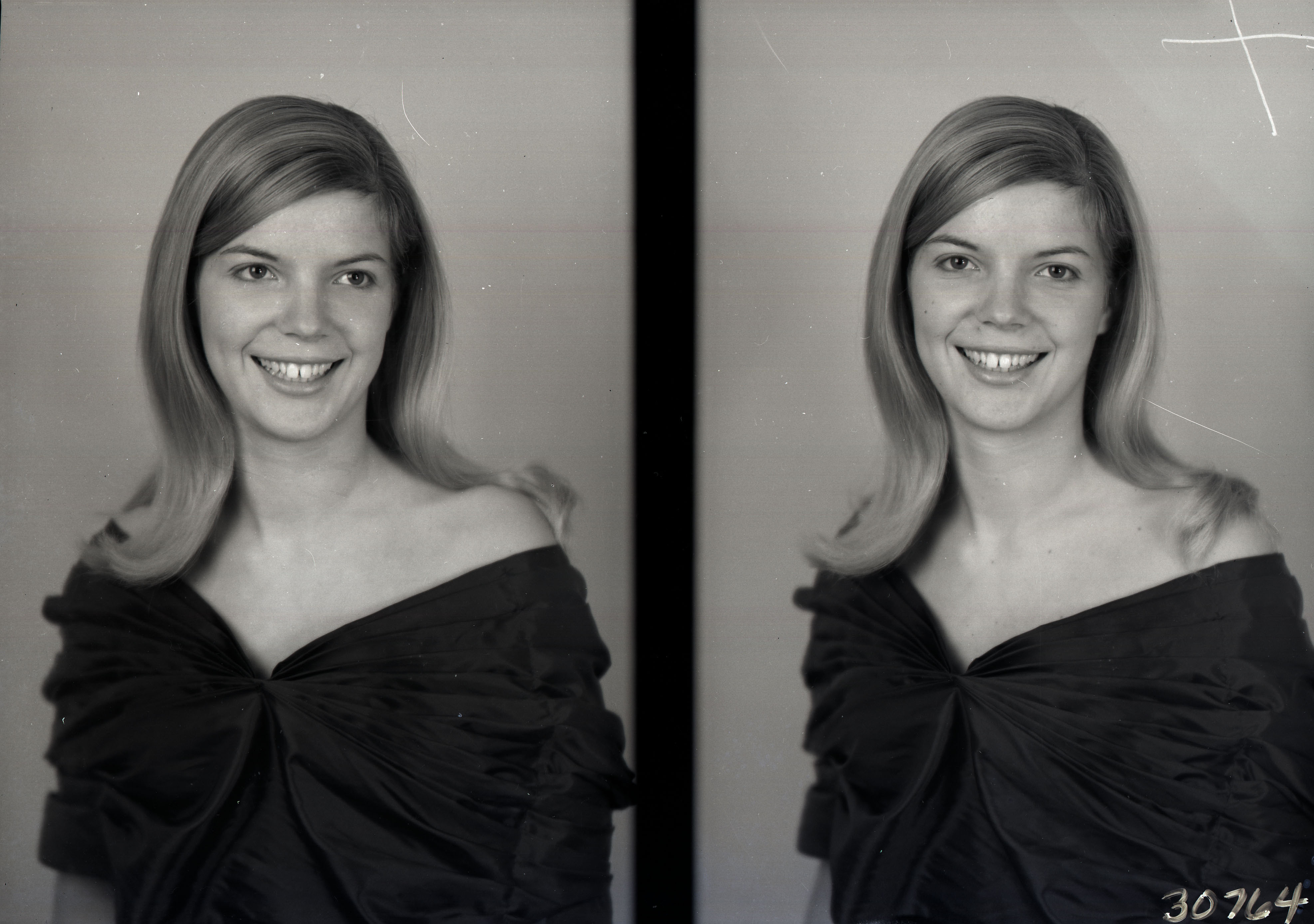 Photo of two separate portrait photographs of the same young woman with long straight hair parted on the side.
