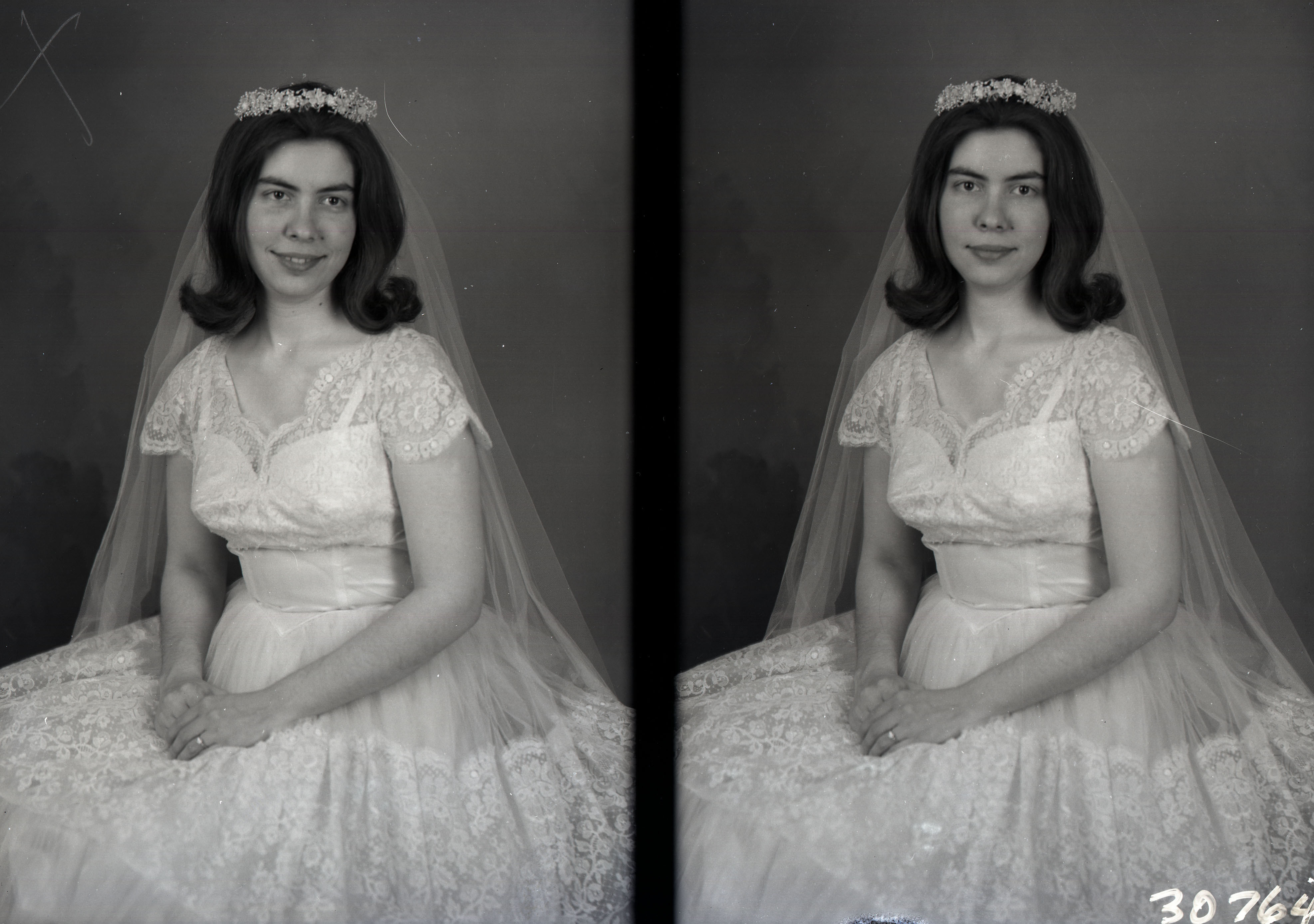 Photo of two separate photographs of Kathy E. (Sheetz) McElroy as a bride in her wedding gown and veil.