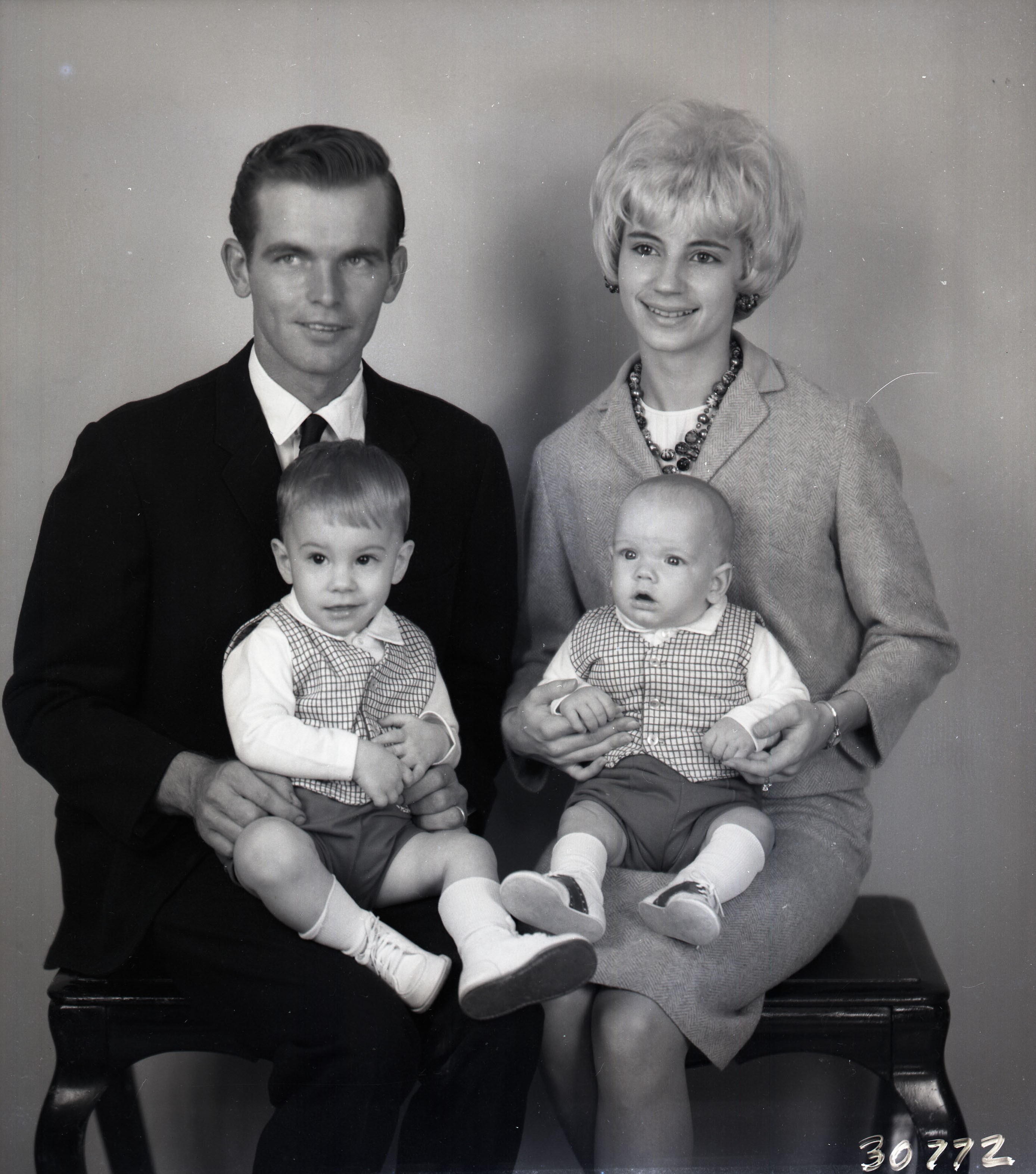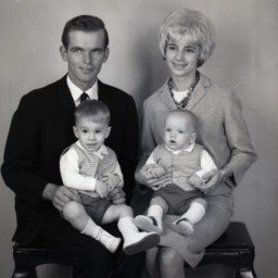 Unidentified young man and blond woman are seated together, each with a very young boy on their lap.