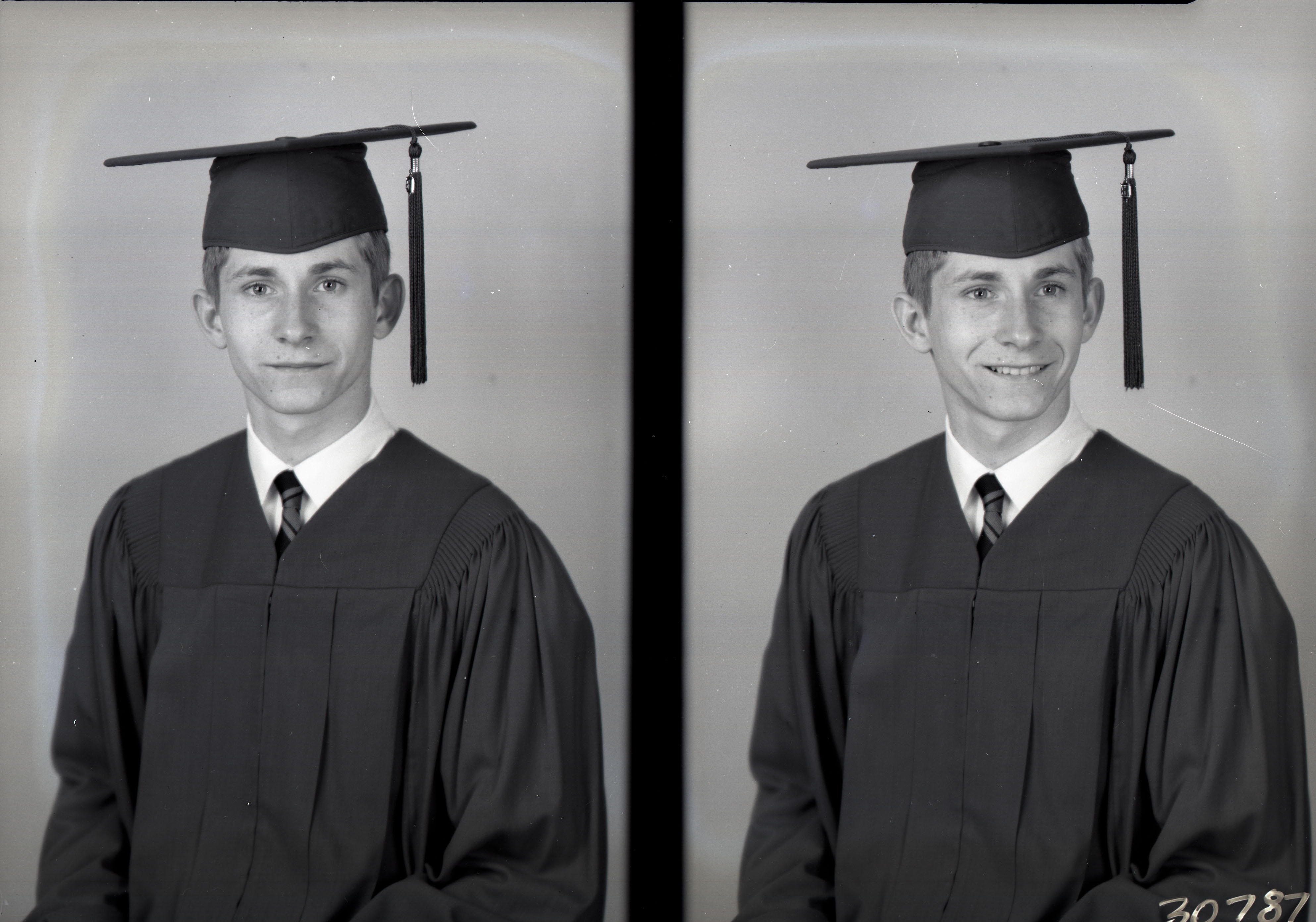 Photo of two separate portrait photographs of the same unidentified young man wearing his graduation cap and gown.