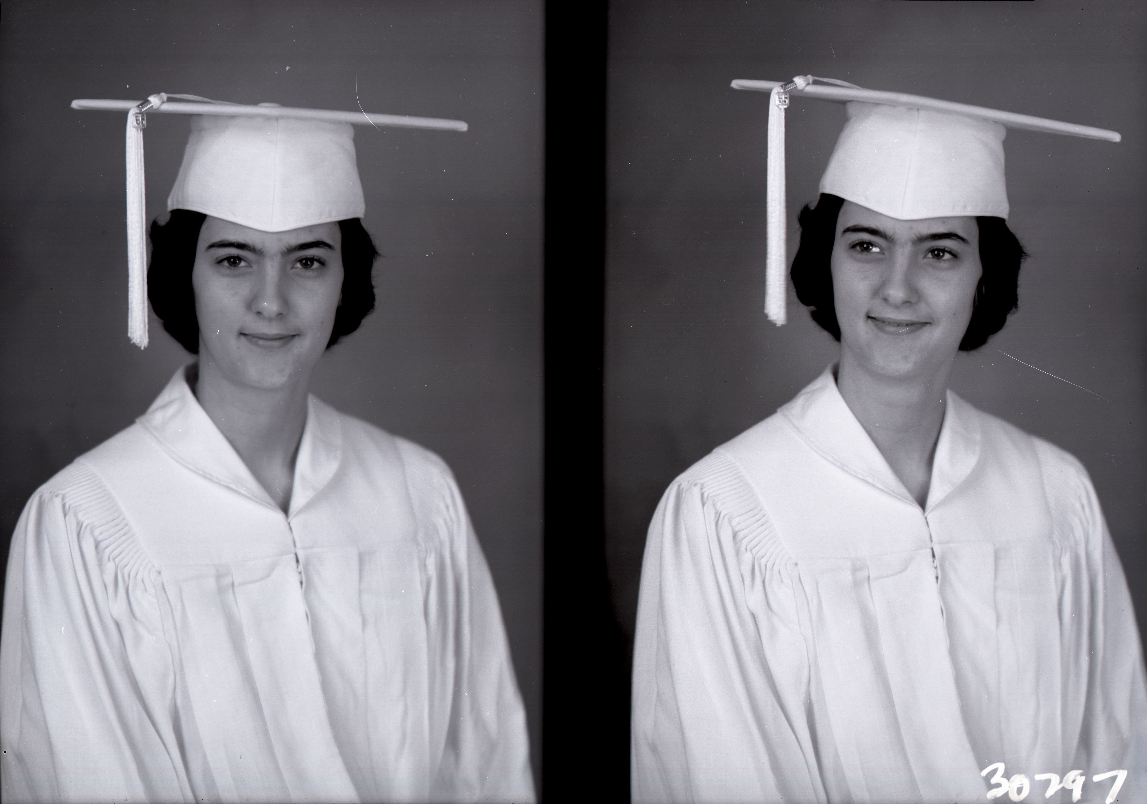 Photo of two separate portrait photographs of the same unidentified young woman in her graduation cap and gown.
