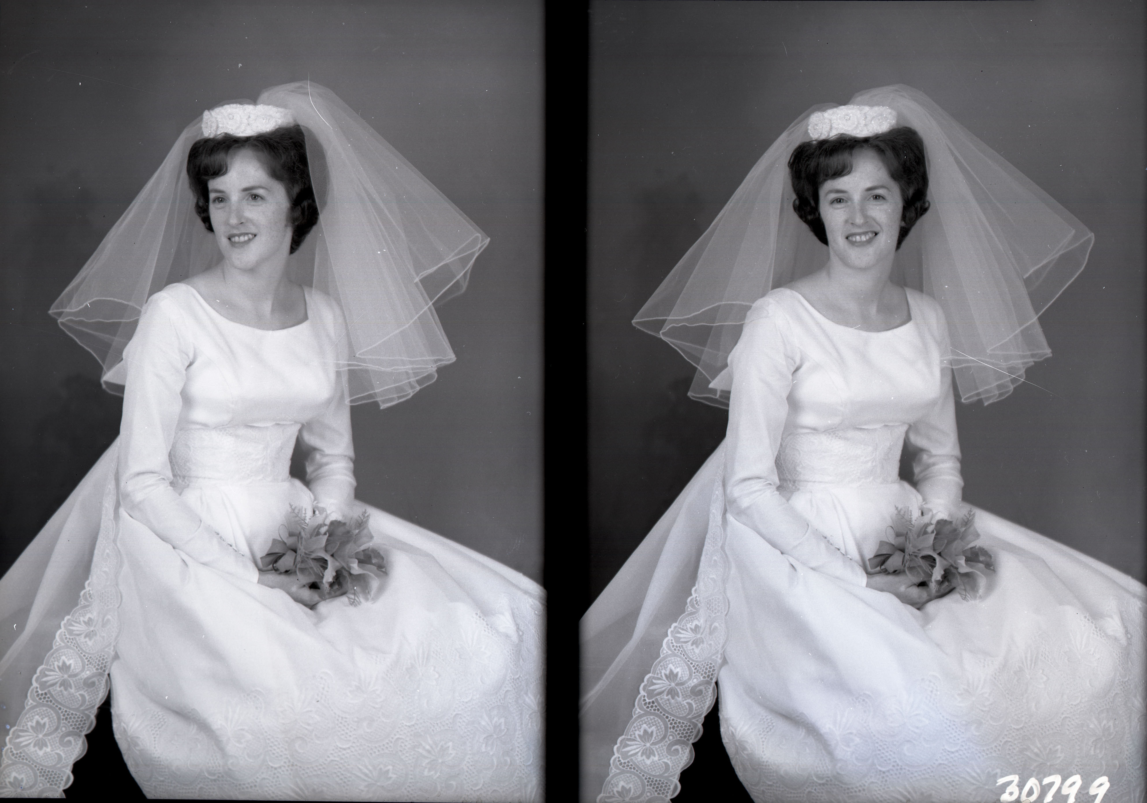 Photo of two separate photographs of an unidentified bride in her wedding gown, veil and bouquet.