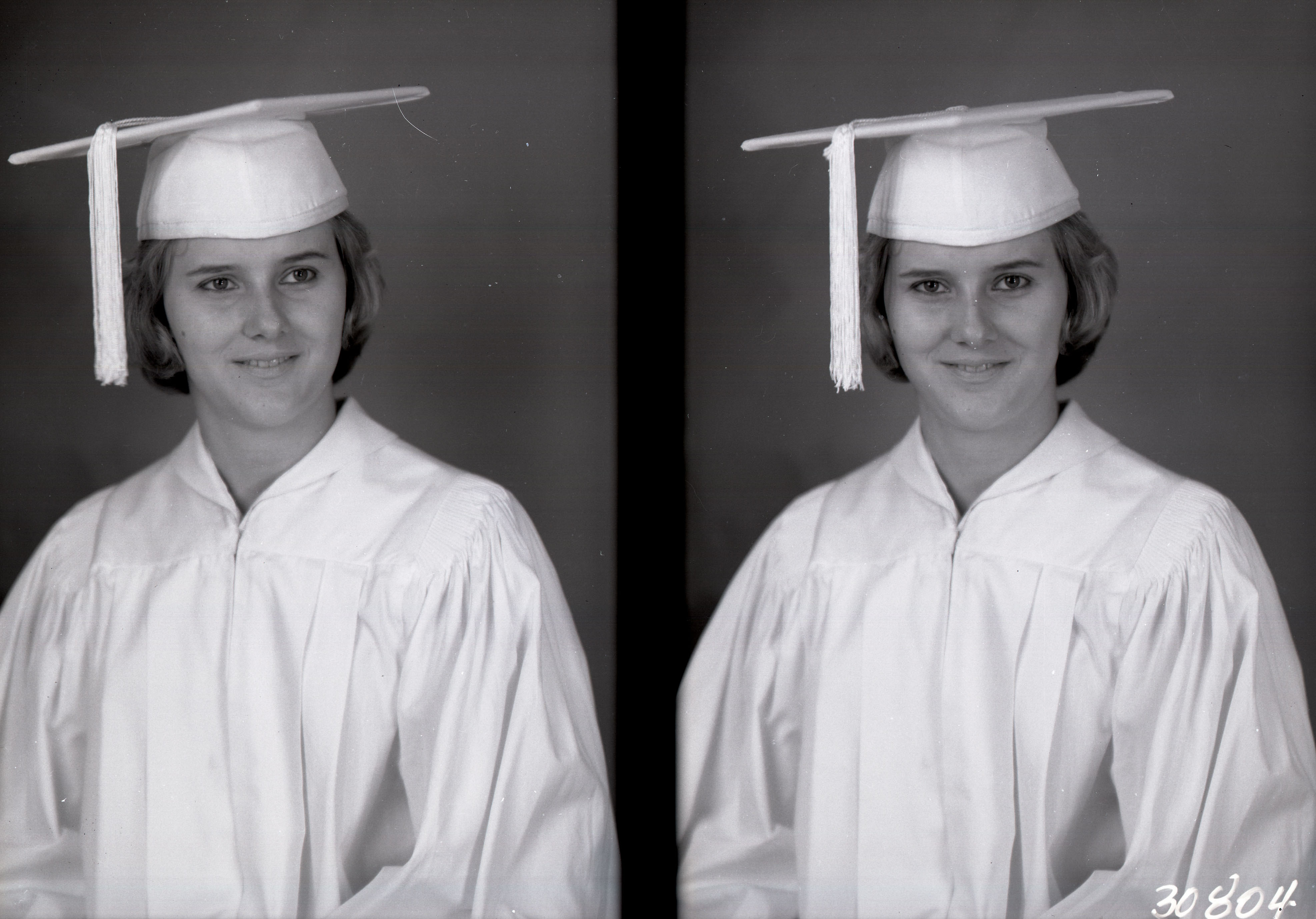 Photo of two separate portrait photographs of the same unidentified young woman in her graduation cap and gown.