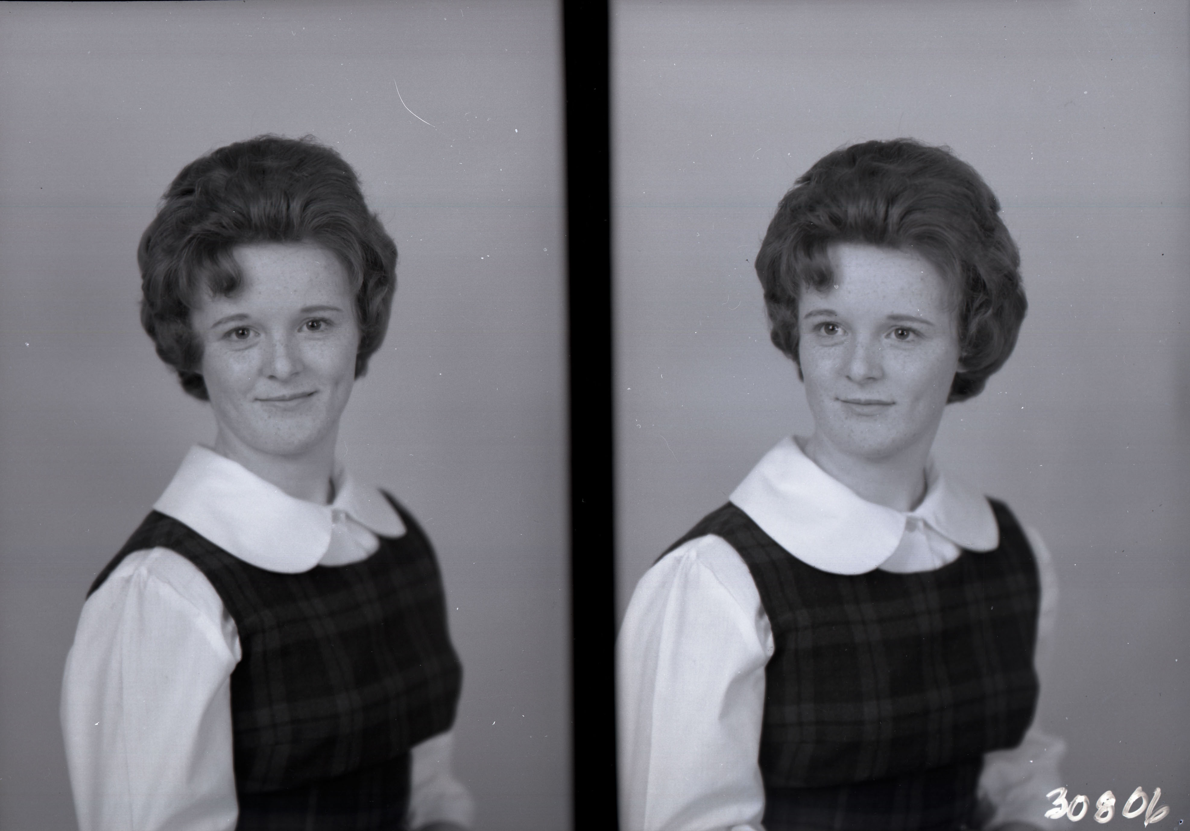 Photo of two separate portrait photographs of Sandra Lee (Seal) Funk as a young woman with short, styled hair and wearing a plaid jumper.