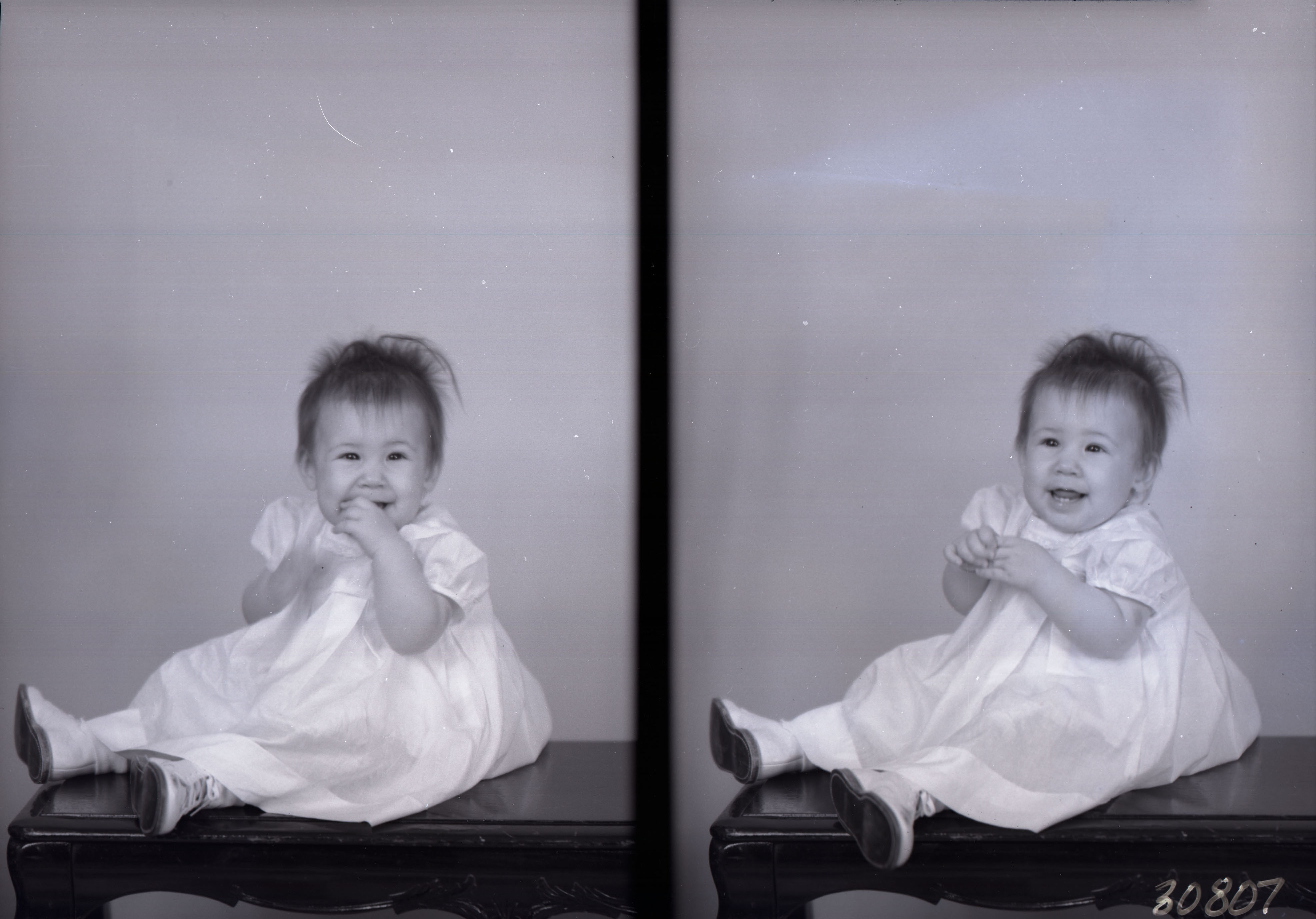 Photo of two separate photographs of the same unidentified young child seated on a bench and smiling.