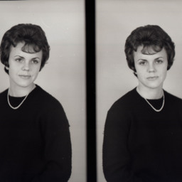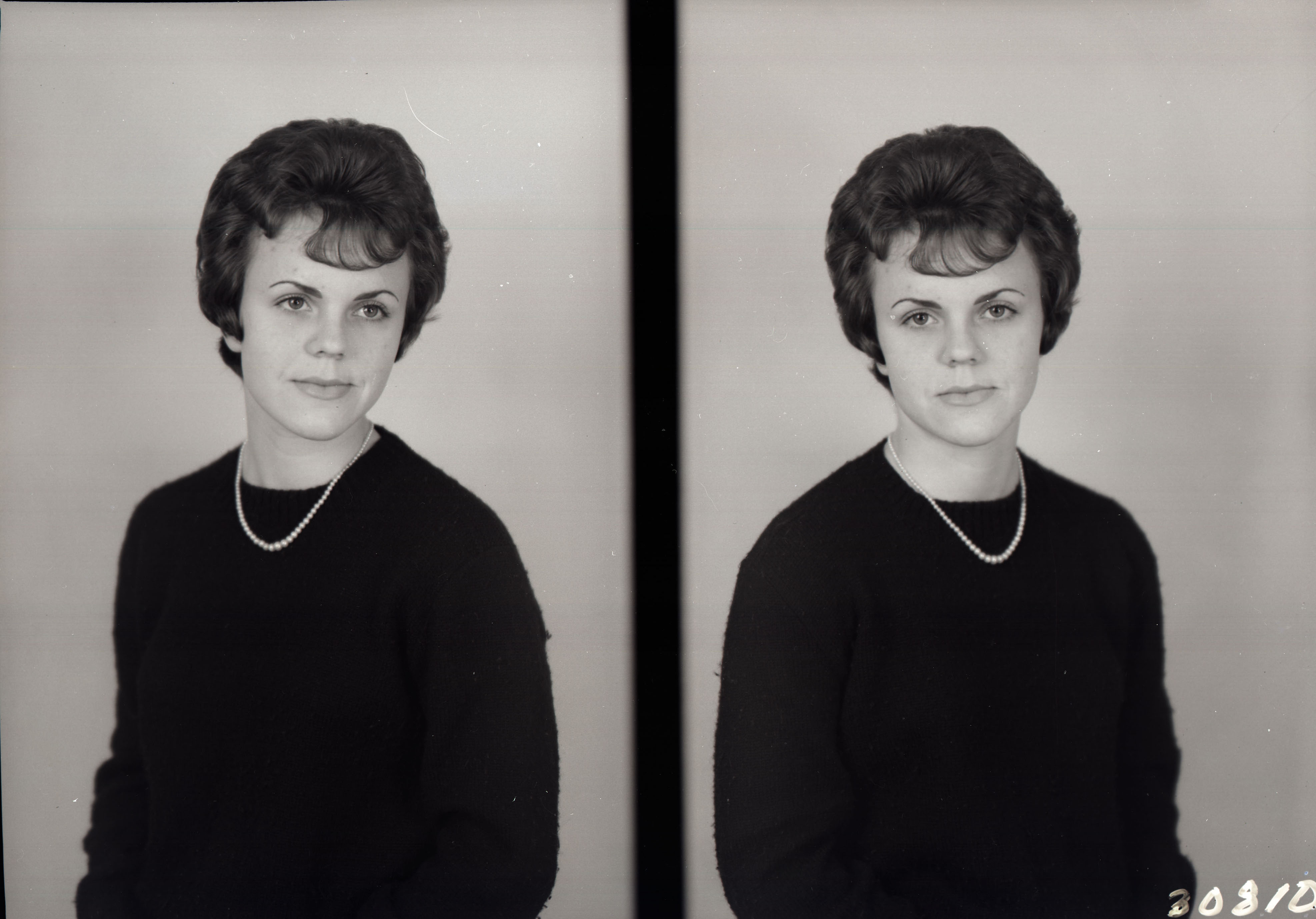 Photo of two separate portrait photographs of the same unidentified woman with short, styled hair and wearing a faux pearl necklace with her outfit.