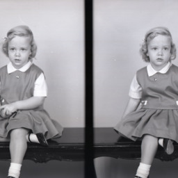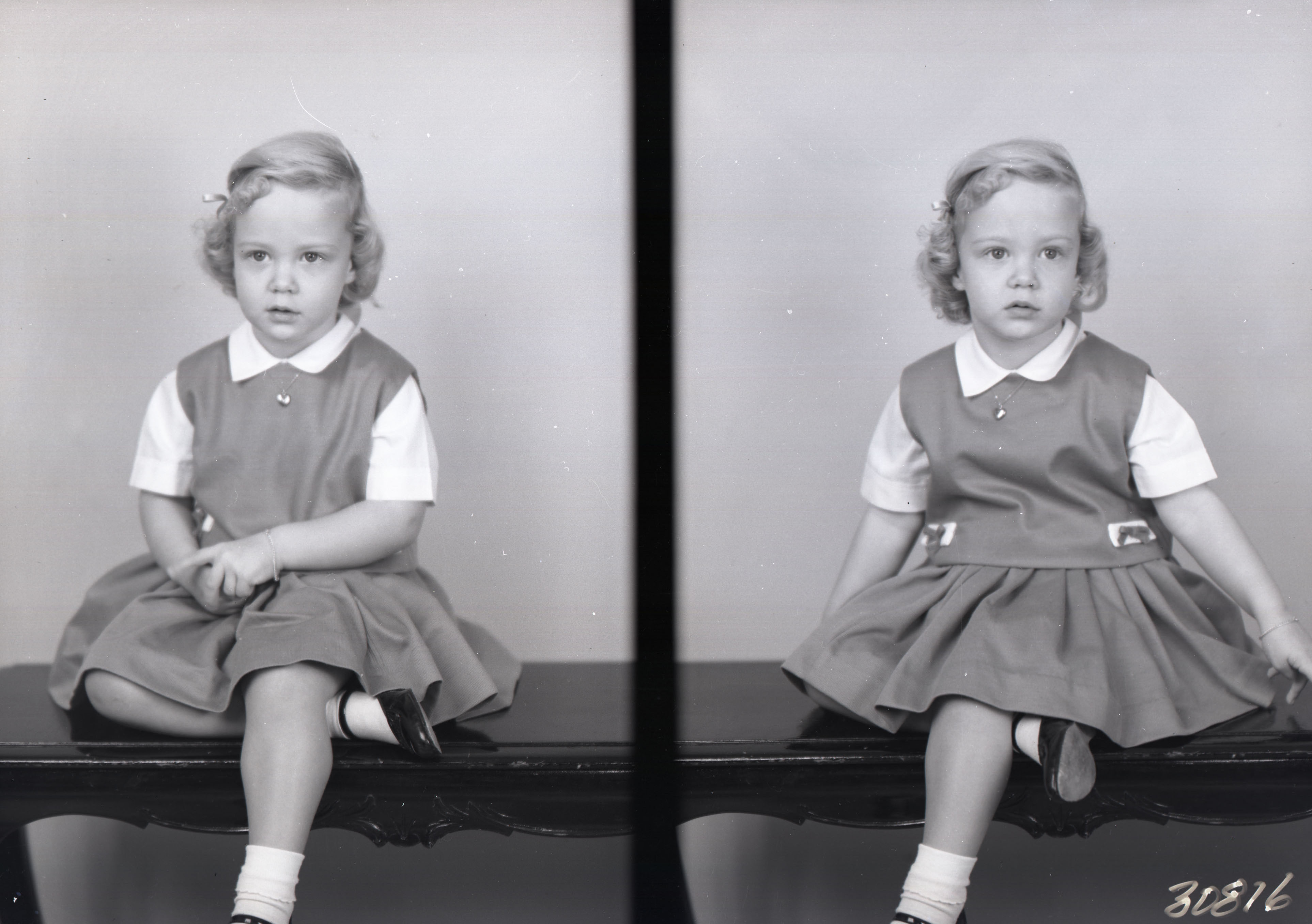 Photo of two separate photographs of the same unidentified girl with short blond hair and seated on a bench with one leg under the other.