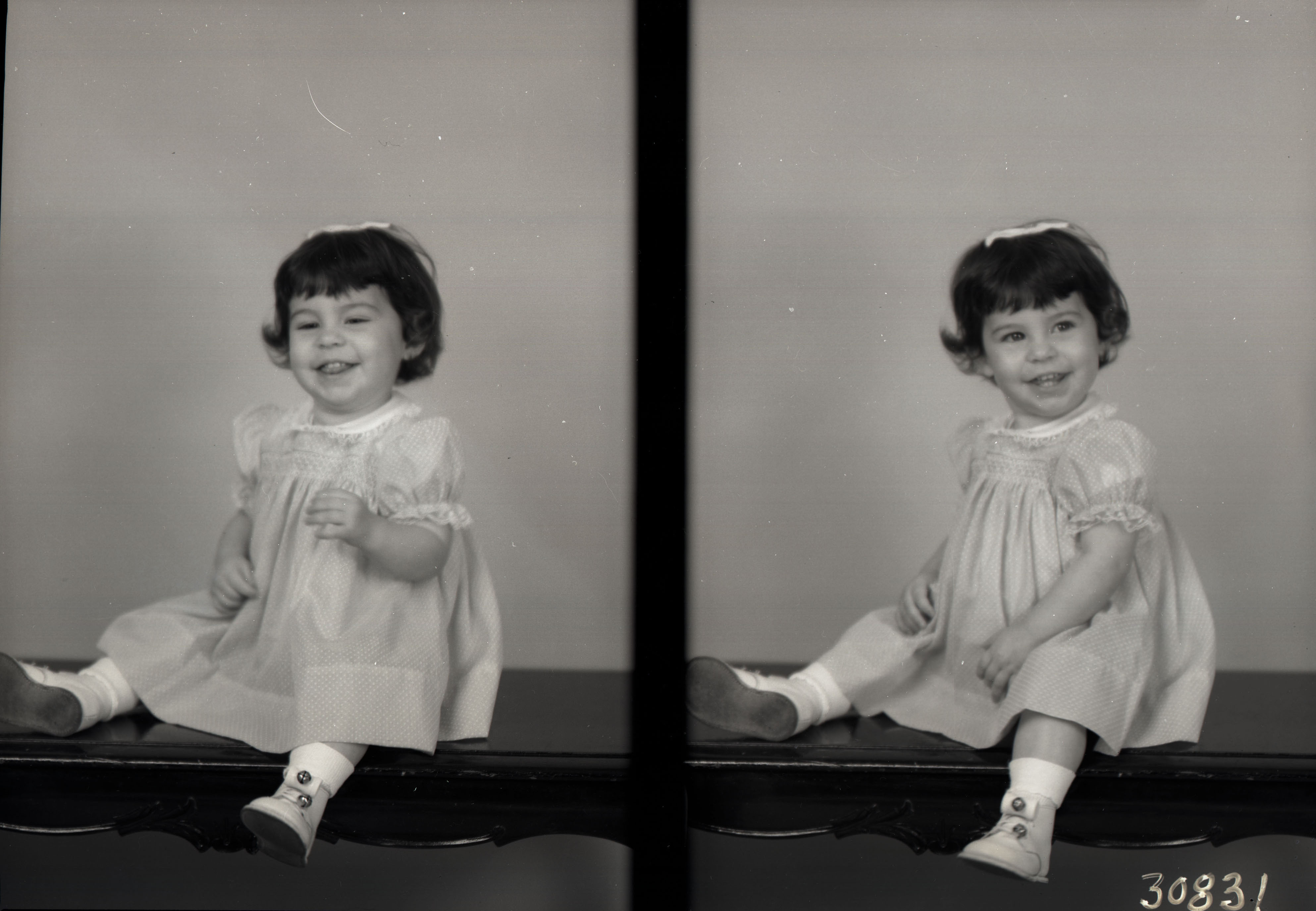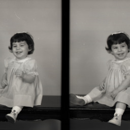 Photo of two separate photographs of the same unidentified young girl with short hair and bangs seated on a bench.