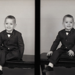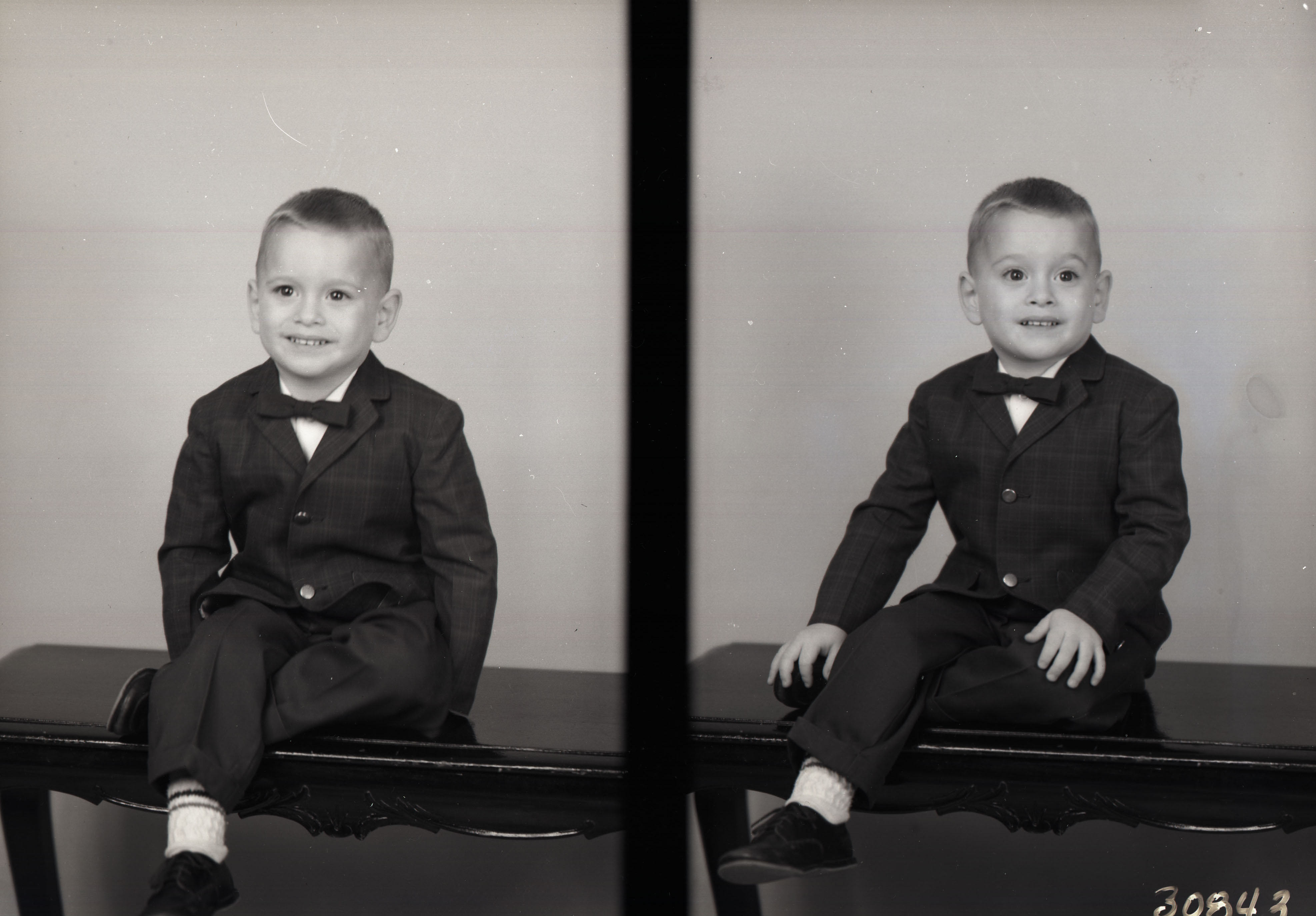 Photo of two separate photographs of the same unidentified young boy seated on a bench and wearing a suit and bow tie.