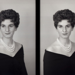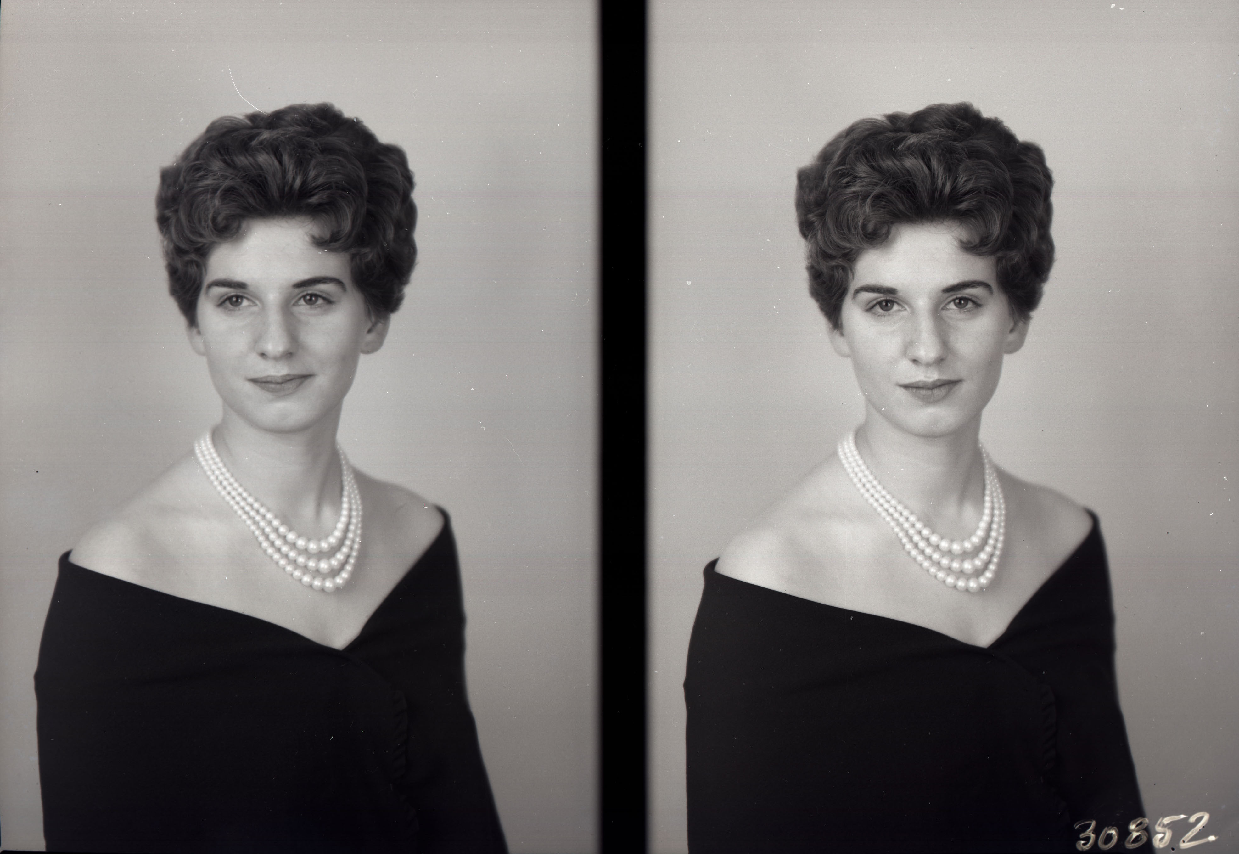 Photo of two separate portrait photographs of the same unidentified woman with short, styled hair and wearing a necklace.