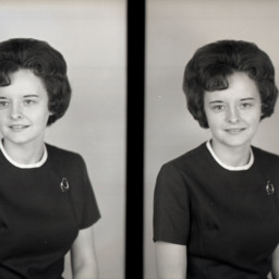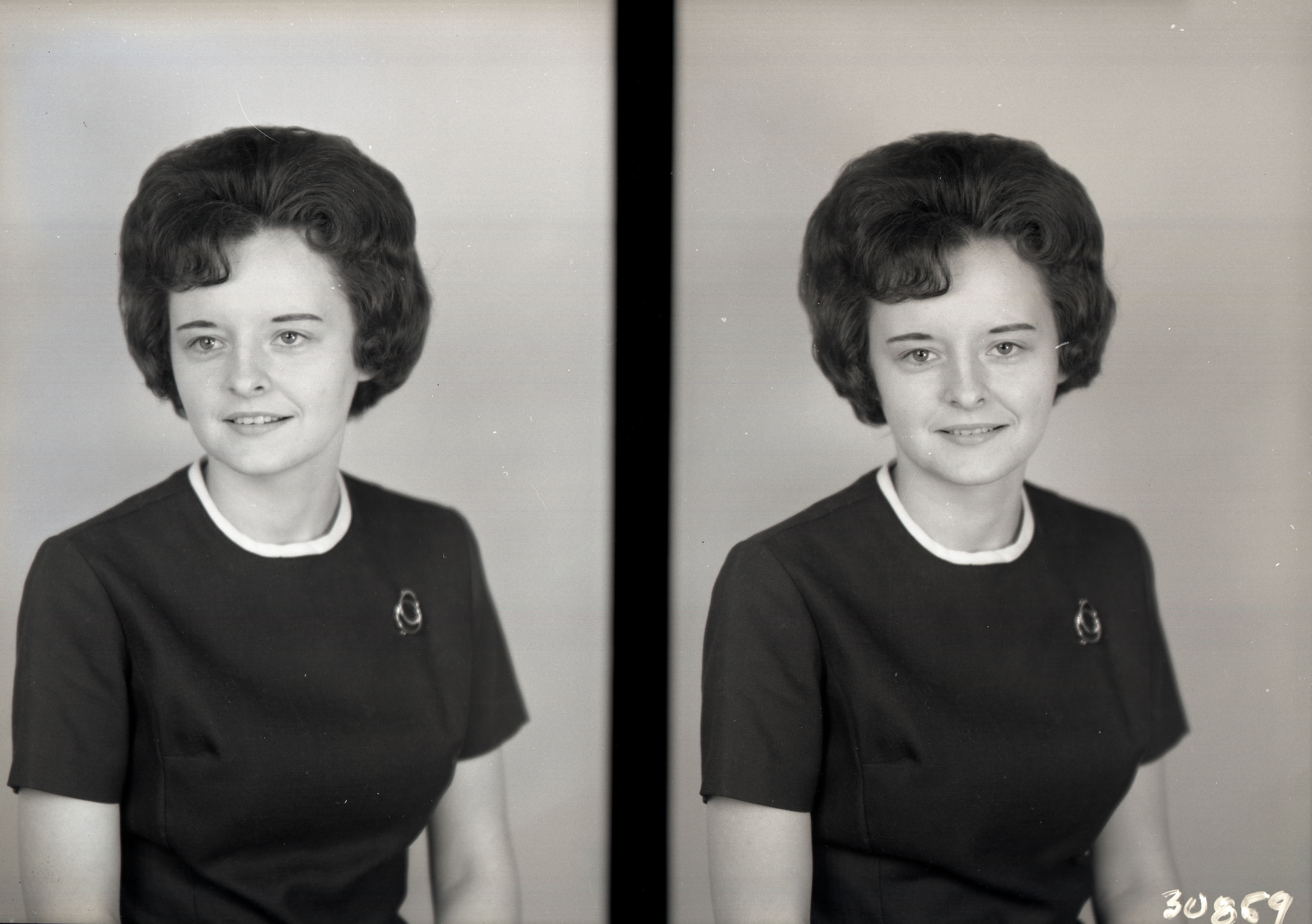Photo of two separate portrait photographs of Linda (Richman) Fadely with short, styled hair and wearing a pin on her short-sleeved dress.