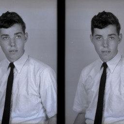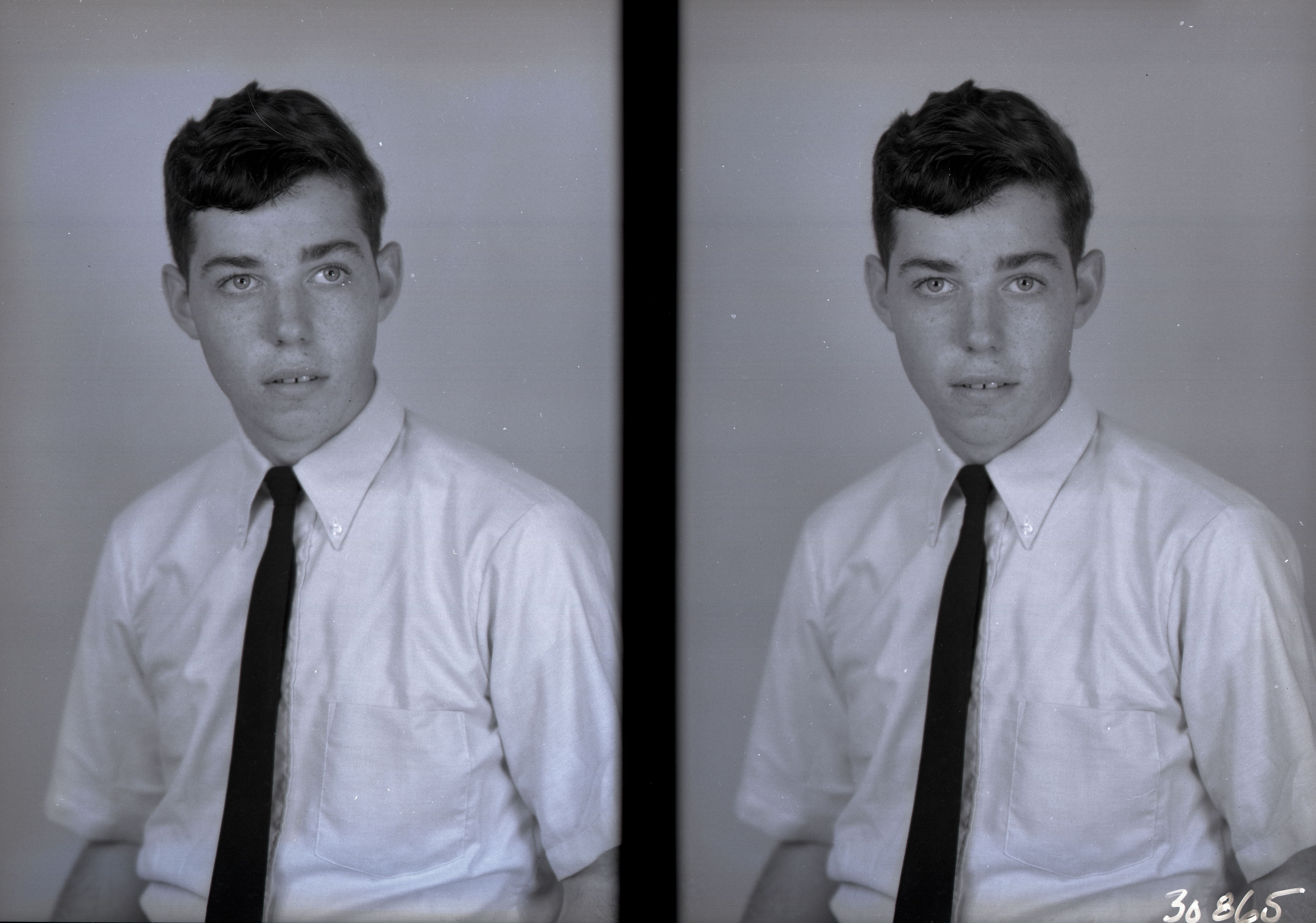 Photo of two separate portrait photographs of the same unidentified teenaged boy wearing a short-sleeved shirt and tie.
