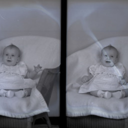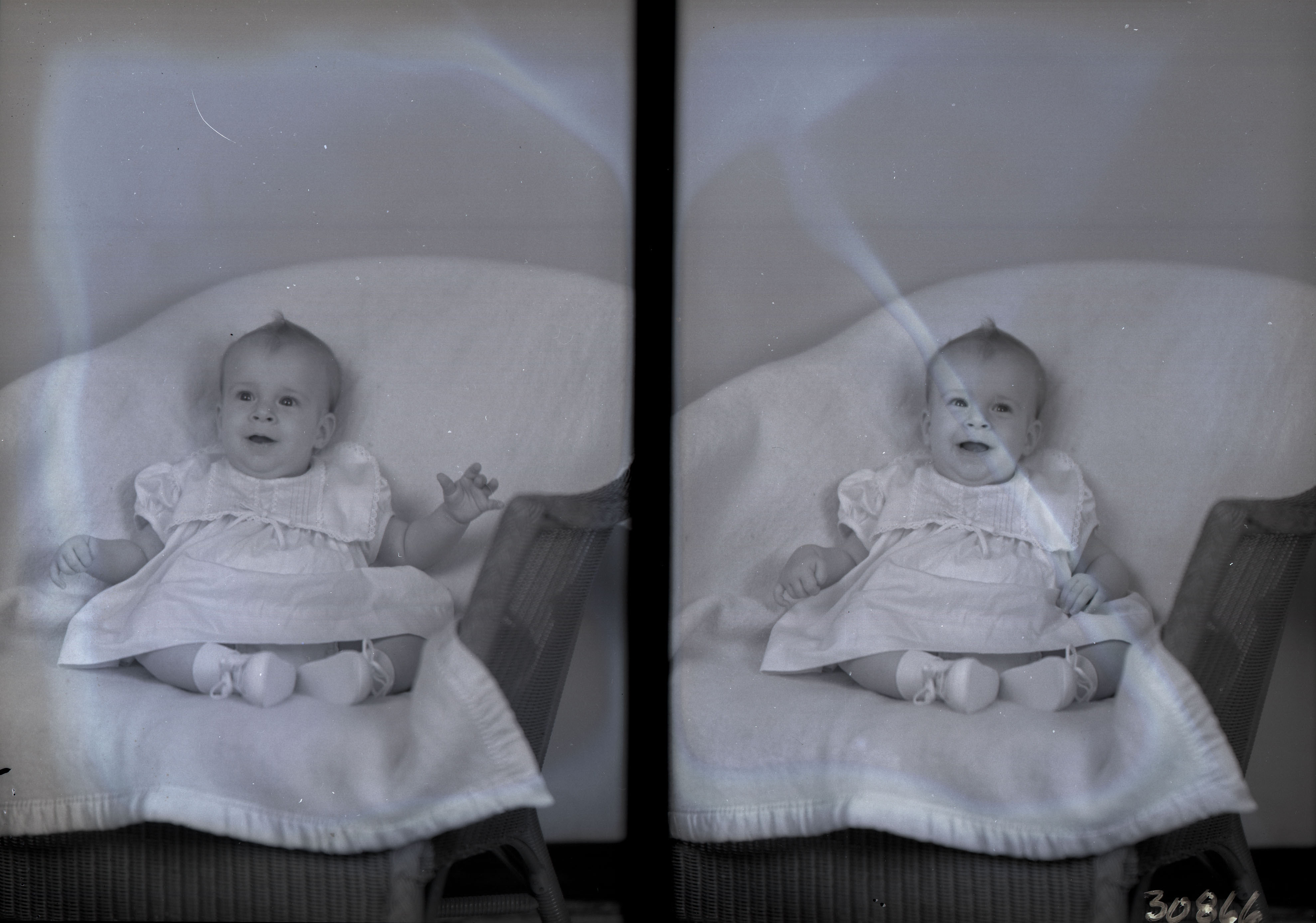 Photo of two separate photographs of the same unidentified young child propped against the back of a covered, wicker chair.