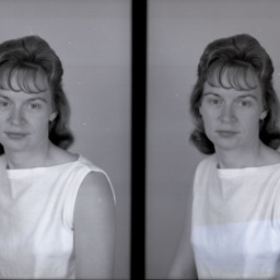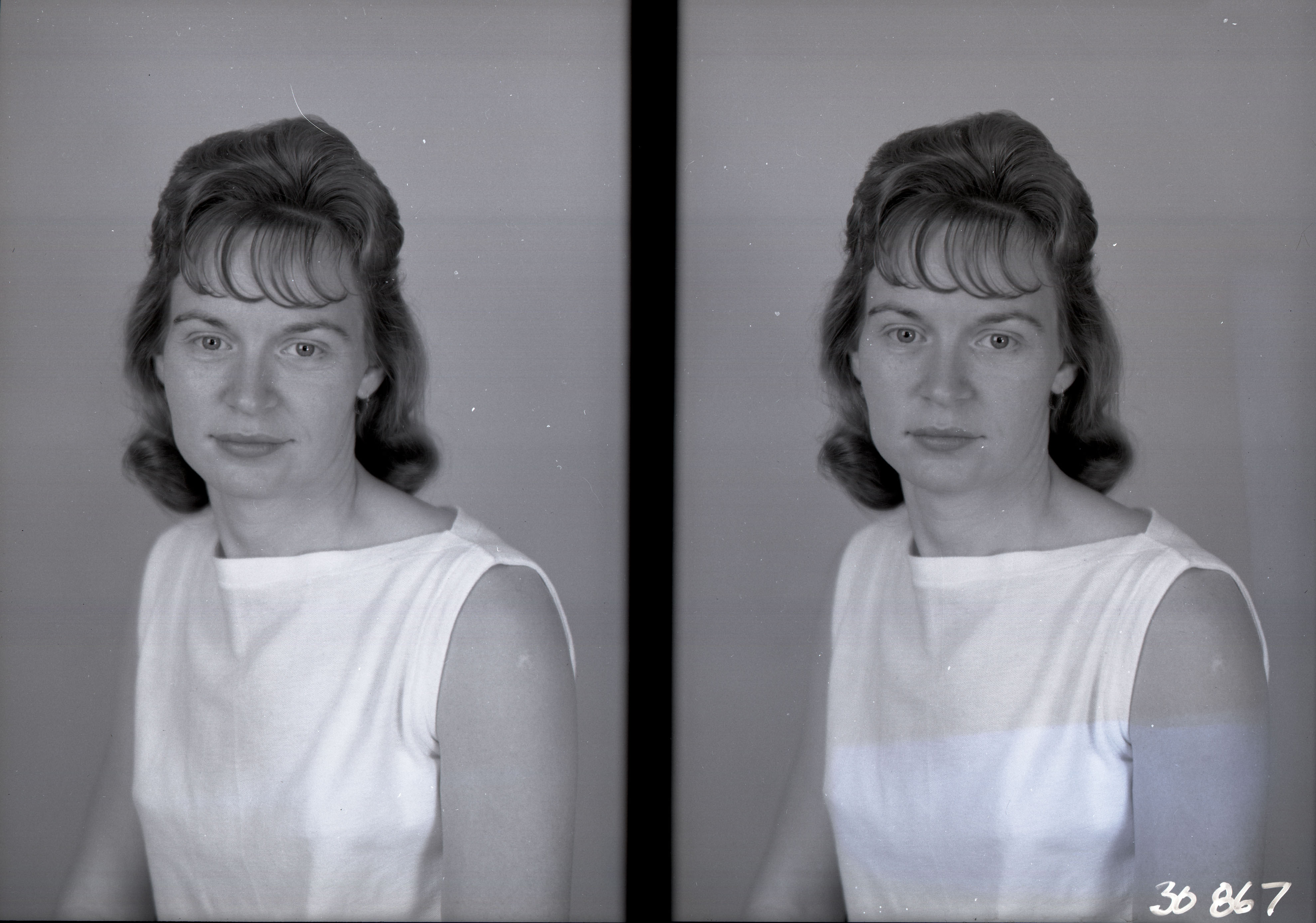 Photo of two separate portrait photographs of the same unidentified woman with bangs and wearing a sleeveless top.