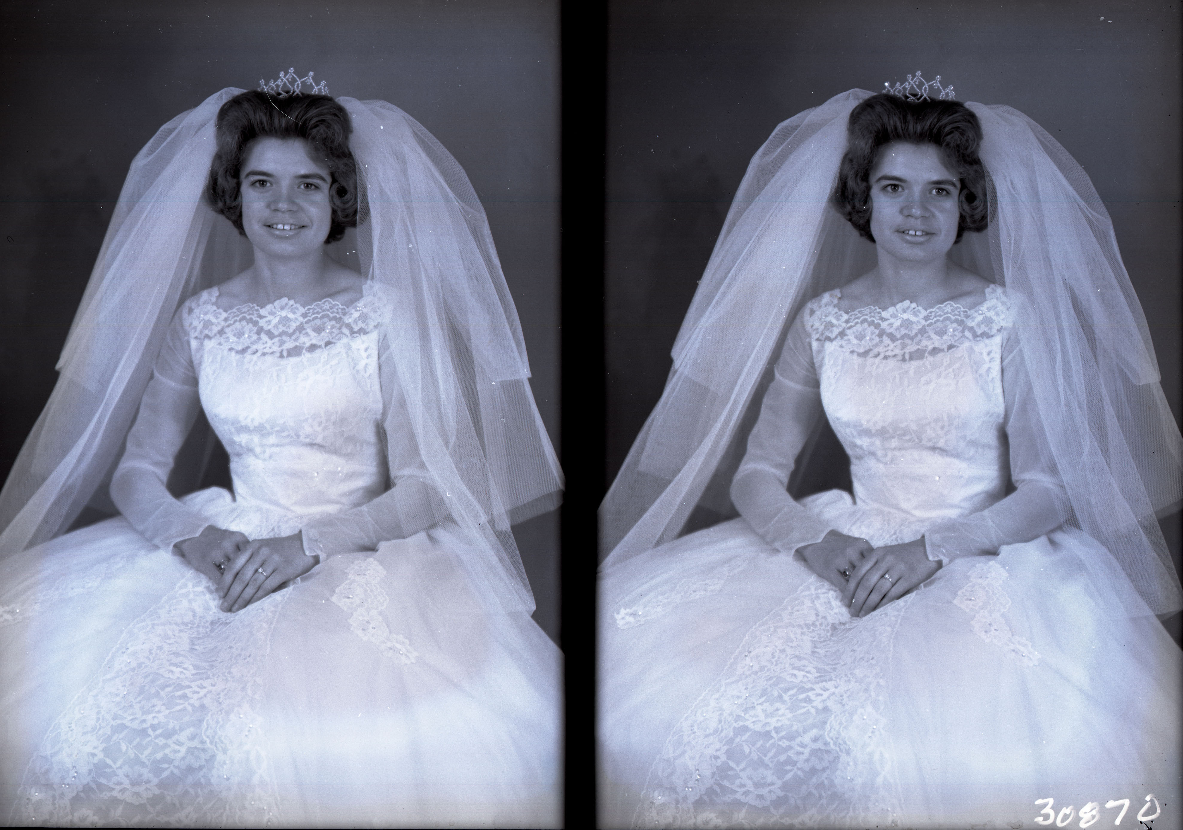Photo of two separate photographs of the same unidentified bride wearing her wedding gown and veil.