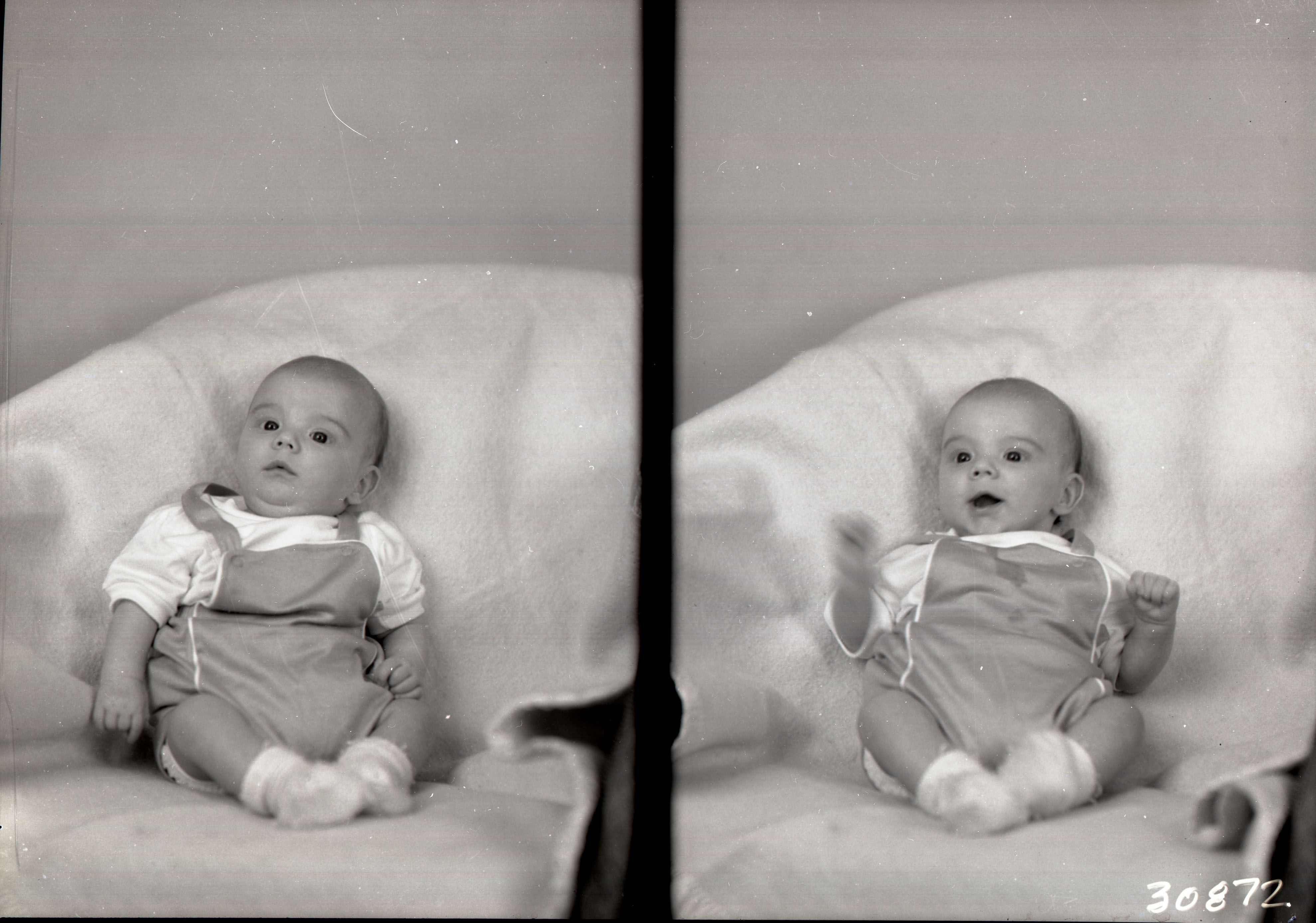 Photo of two separate photographs of the same unidentified baby propped against the back of a covered chair.