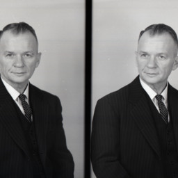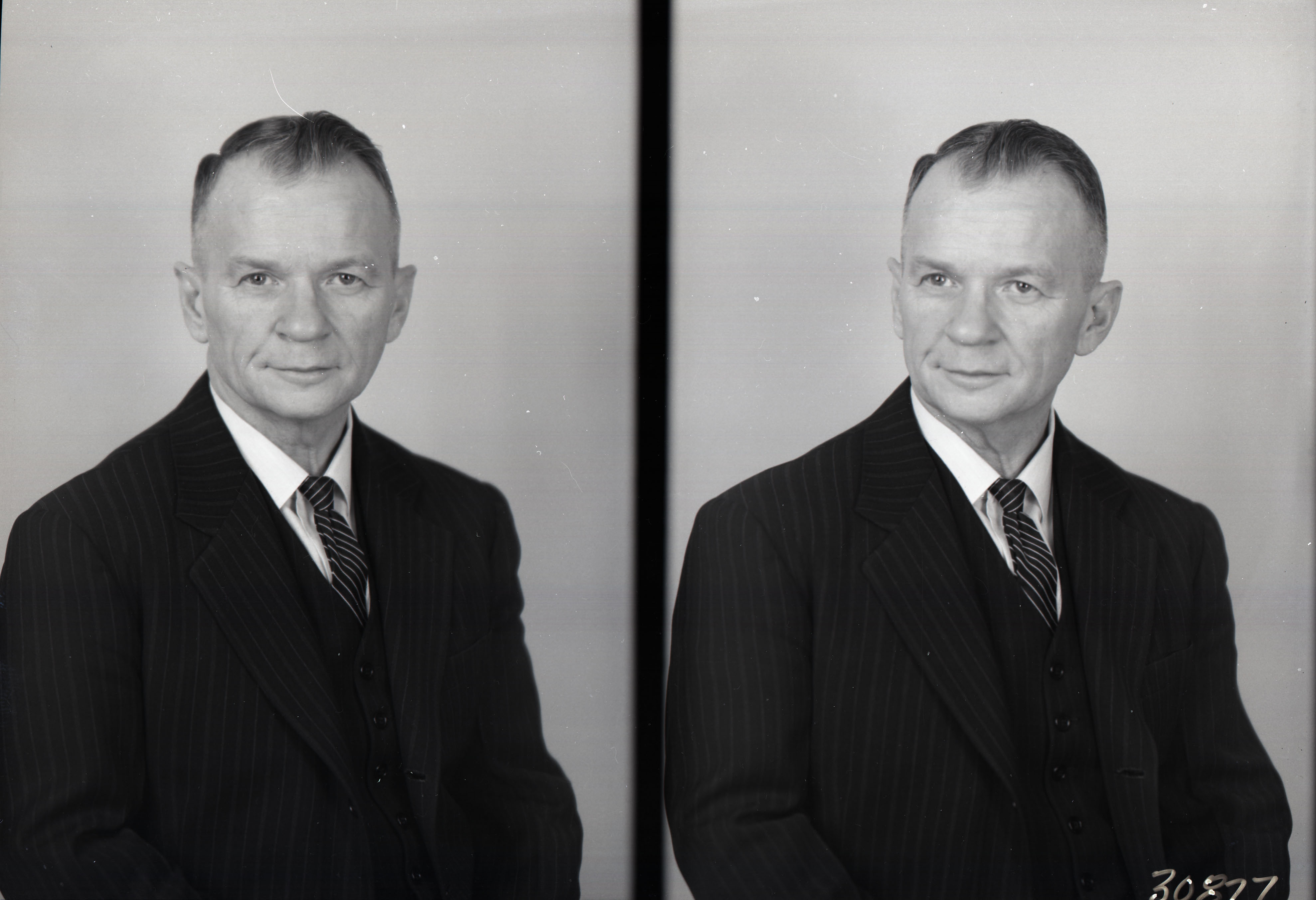 Photo of two separate portrait photographs of the same unidentified man in a striped suit and tie.