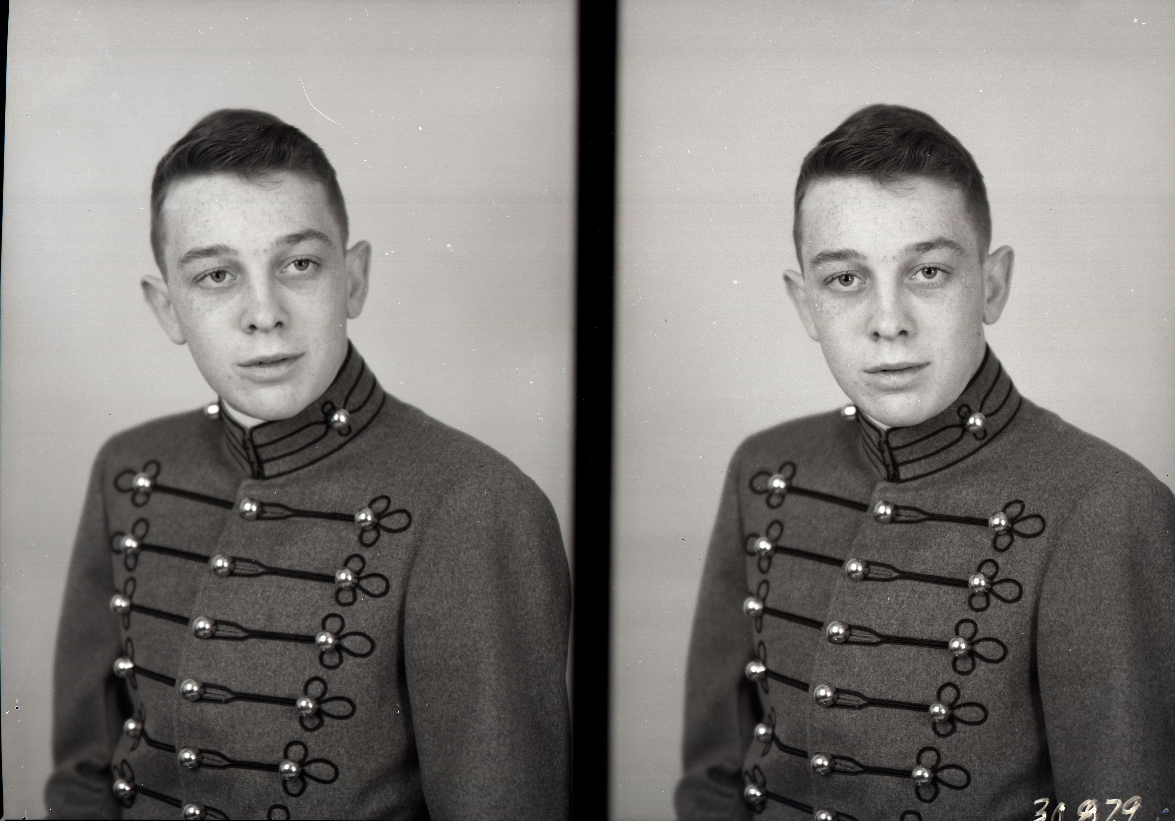 Photo of two separate portrait photographs of an unidentified MMA cadet wearing his school's uniform.