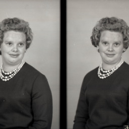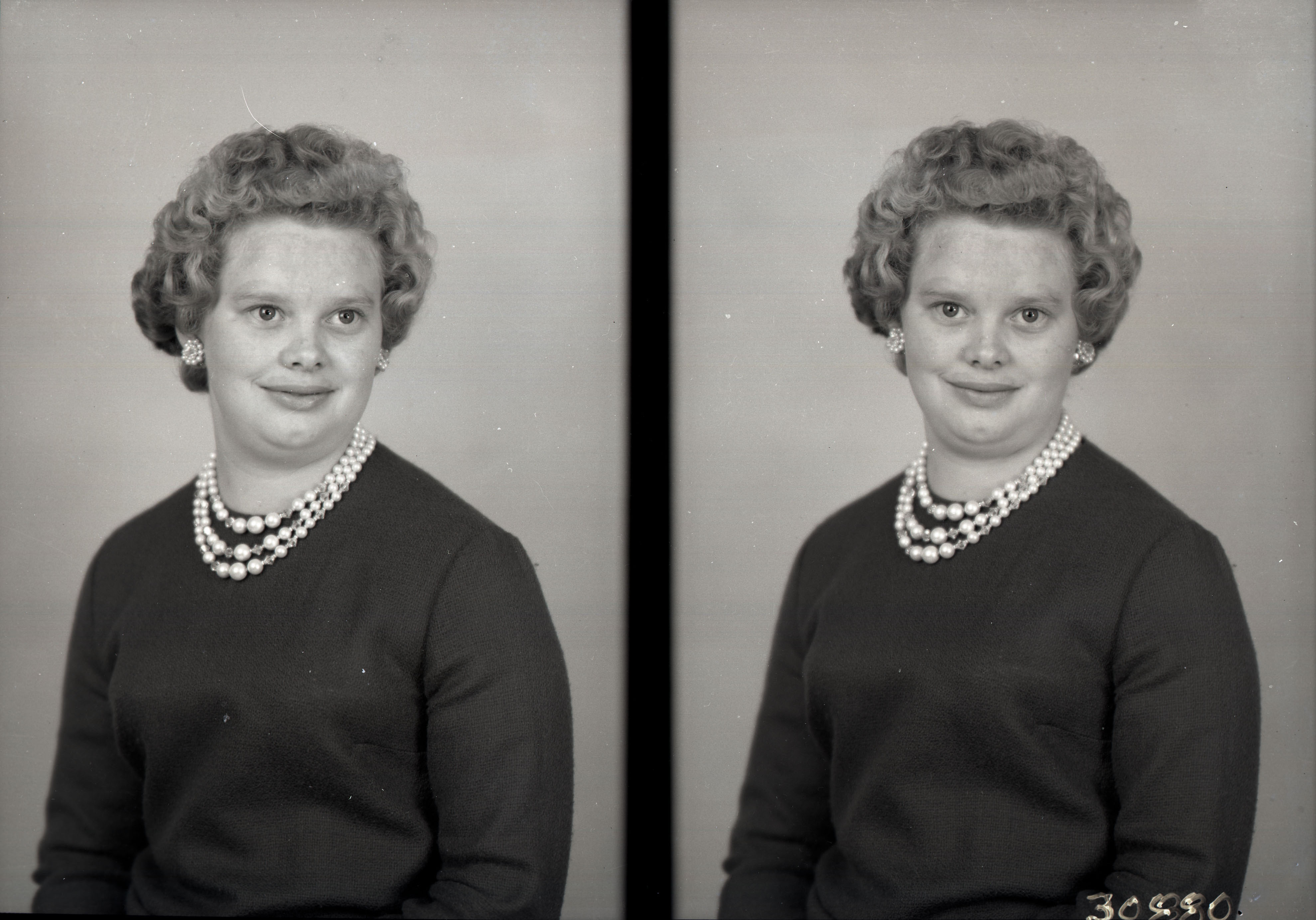 Photo of two separate portrait photographs of Mary Miller as a young woman with short curly hair and wearing a necklace and earrings with her outfit.
