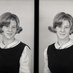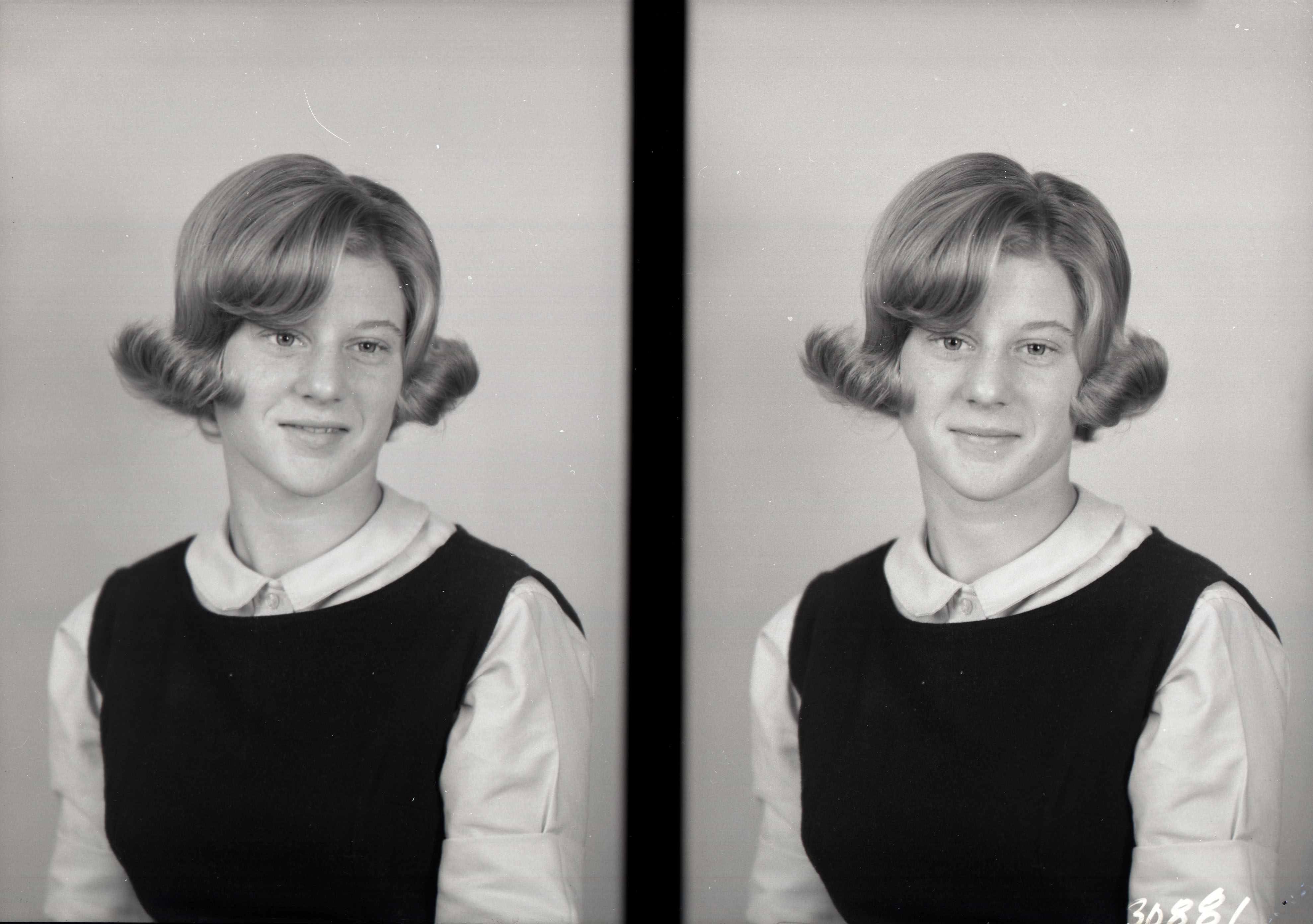 Photo of two separate portrait photographs of the same unidentified young woman with short hair curled outwards and wearing a jumper over a short-sleeved blouse.