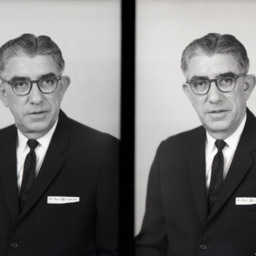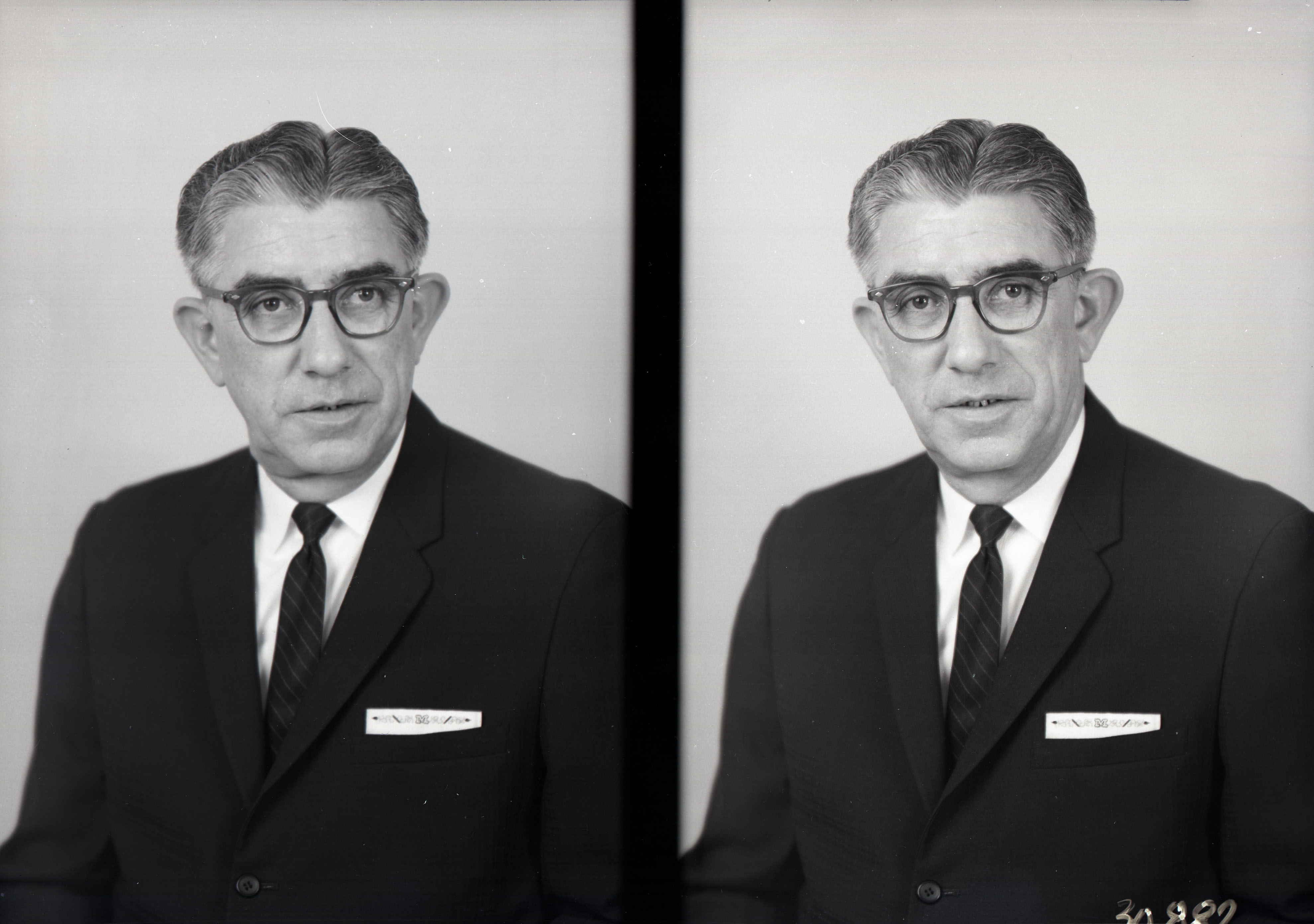 Photo of two separate portrait photographs of the same unidentified man with glasses and wearing a suit and tie. A handkerchief is visible sticking out of his breast pocket.