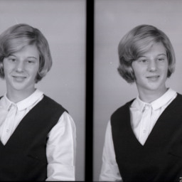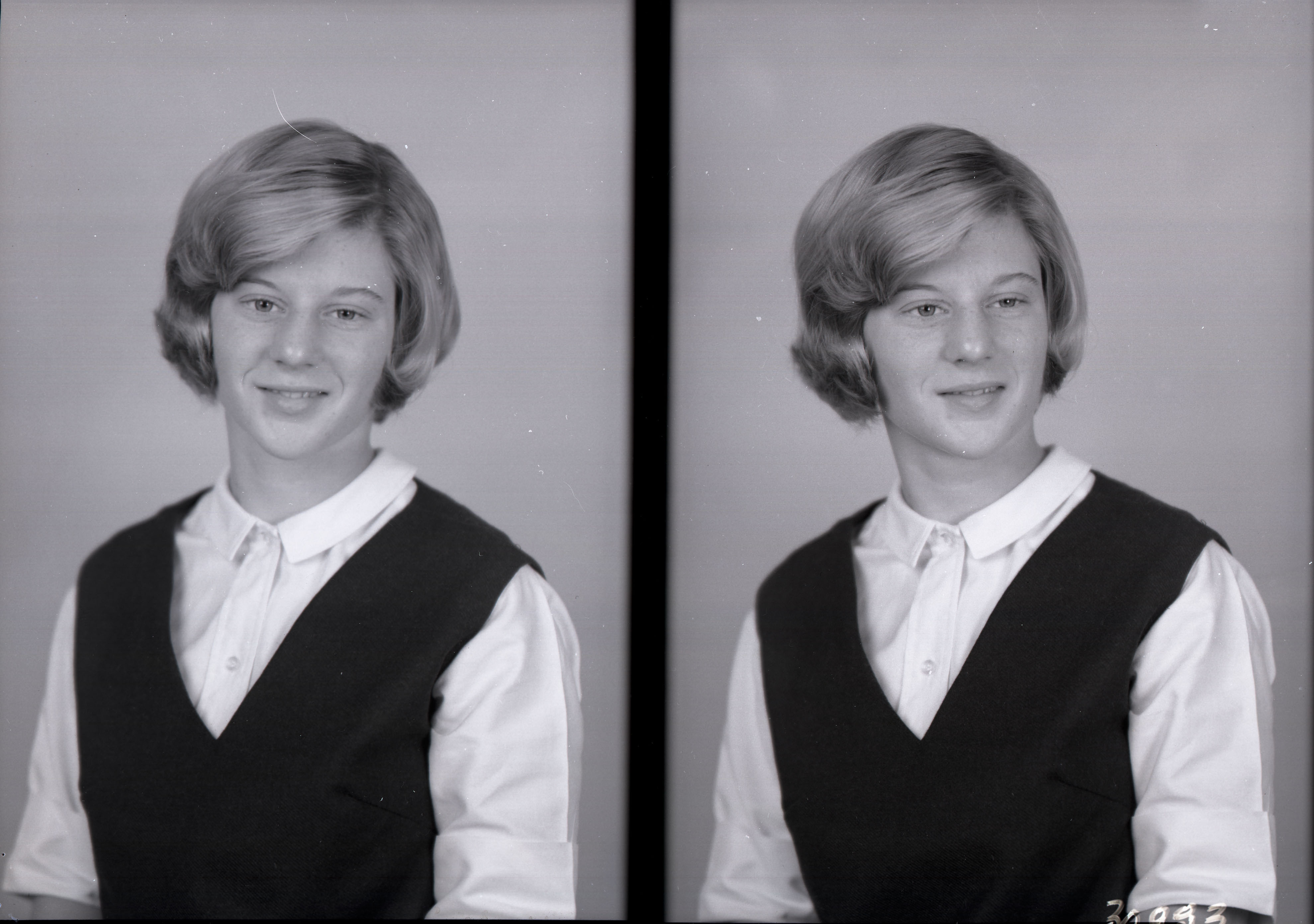 Photo of two separate portrait photographs of the same unidentified young woman with short hair and wearing a V-necked jumper over her blouse.