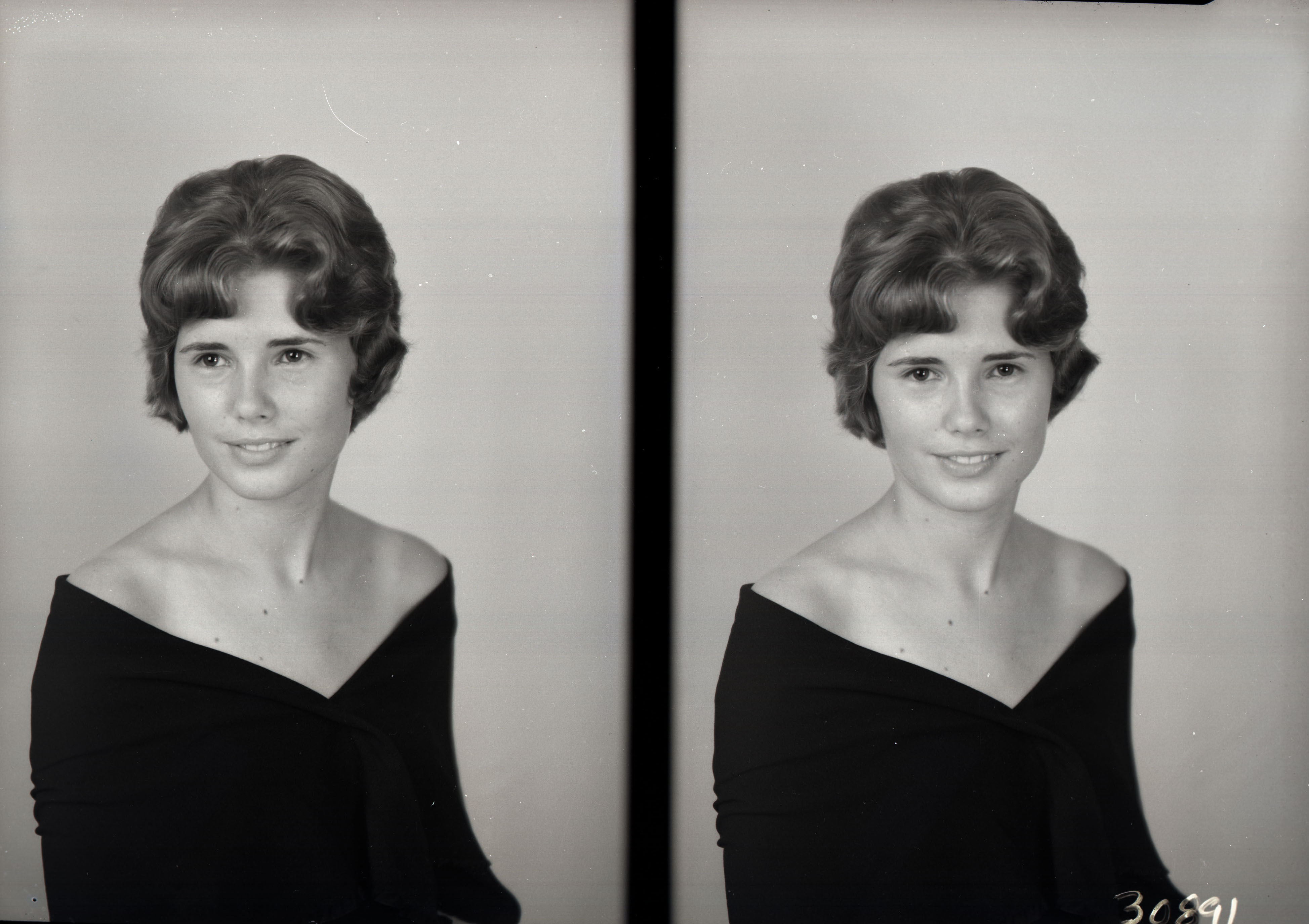 Photo of two separate portrait photographs of Mary Sue (Wine) France as a young woman with short hair.