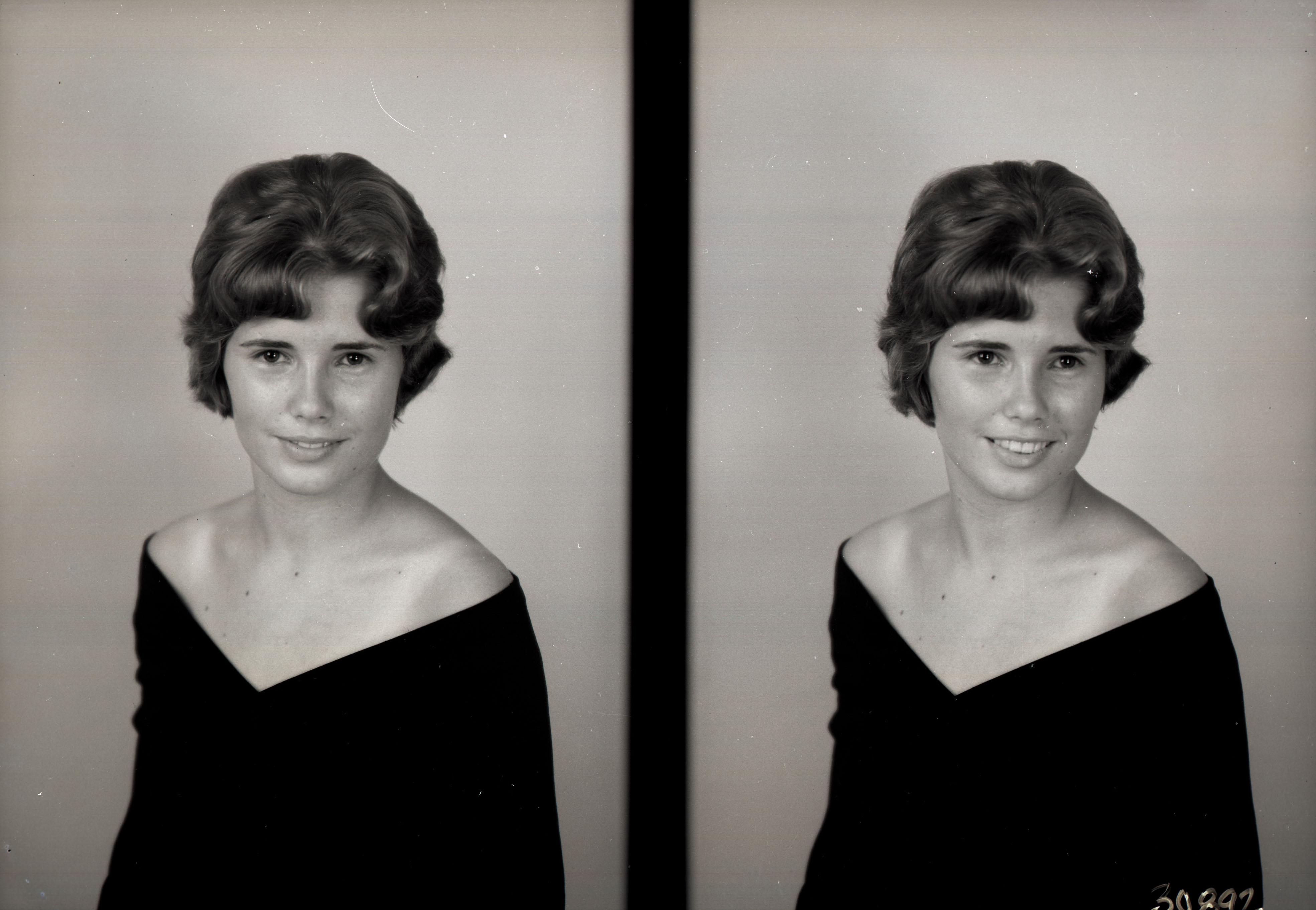 Photo of two separate portrait photographs of Mary Sue (Wine) France as a young woman with short hair.