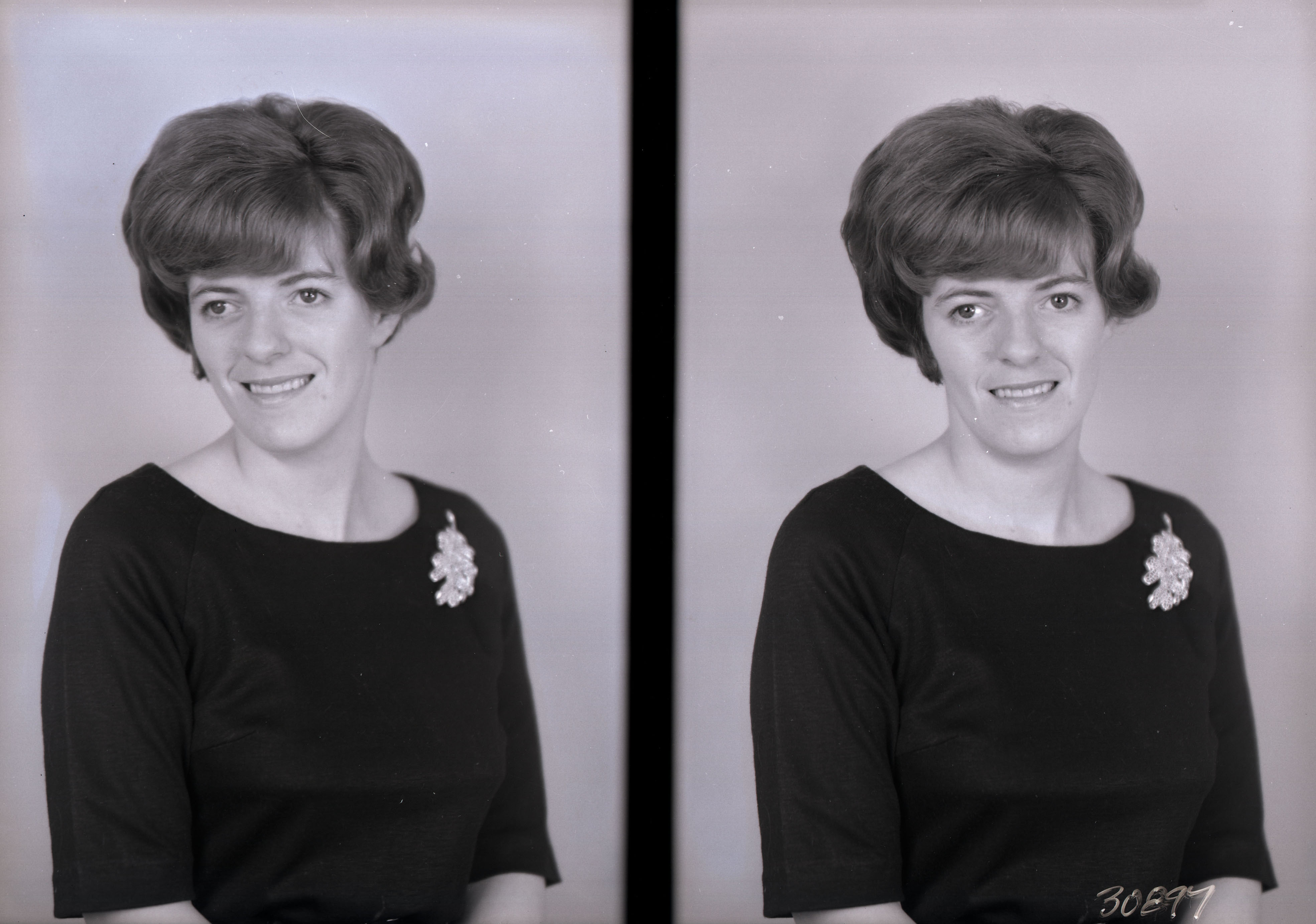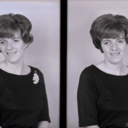 Photo of two separate portrait photographs of the same unidentified woman with short hair and wearing a pin on the front of her top.