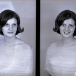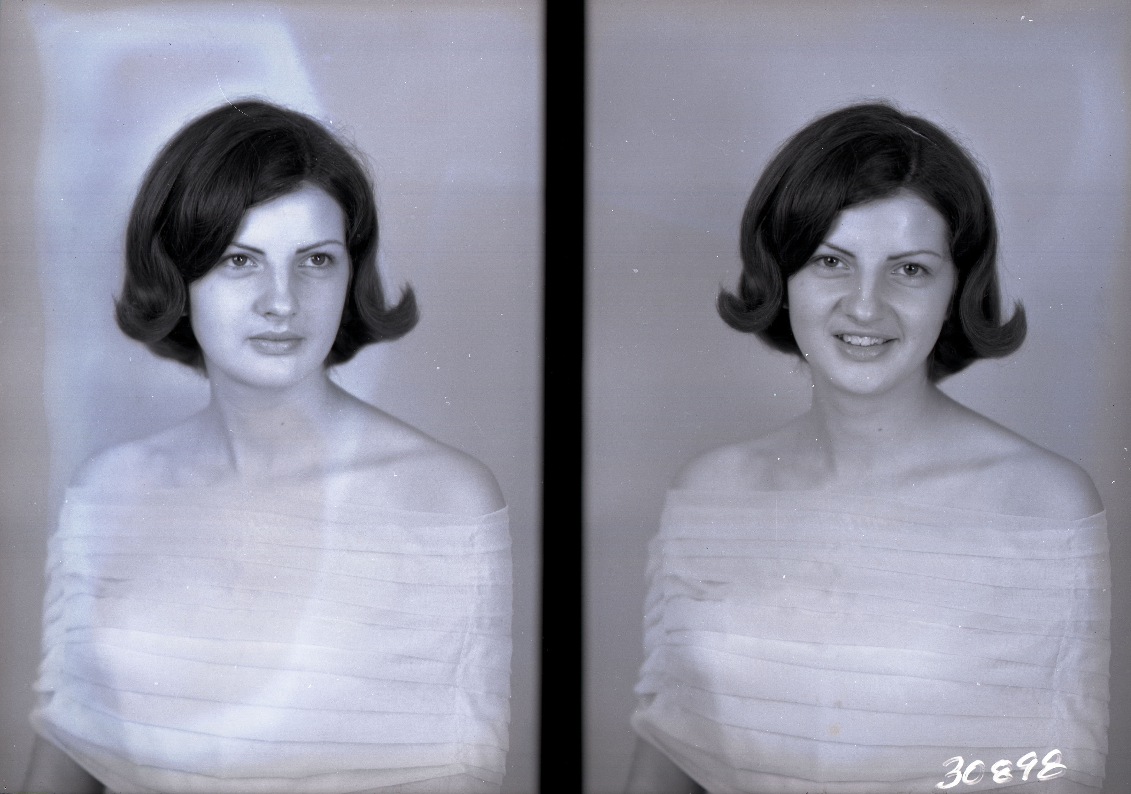 Photo of two separate portrait photographs of the same unidentified woman with short hair curled outwards.
