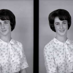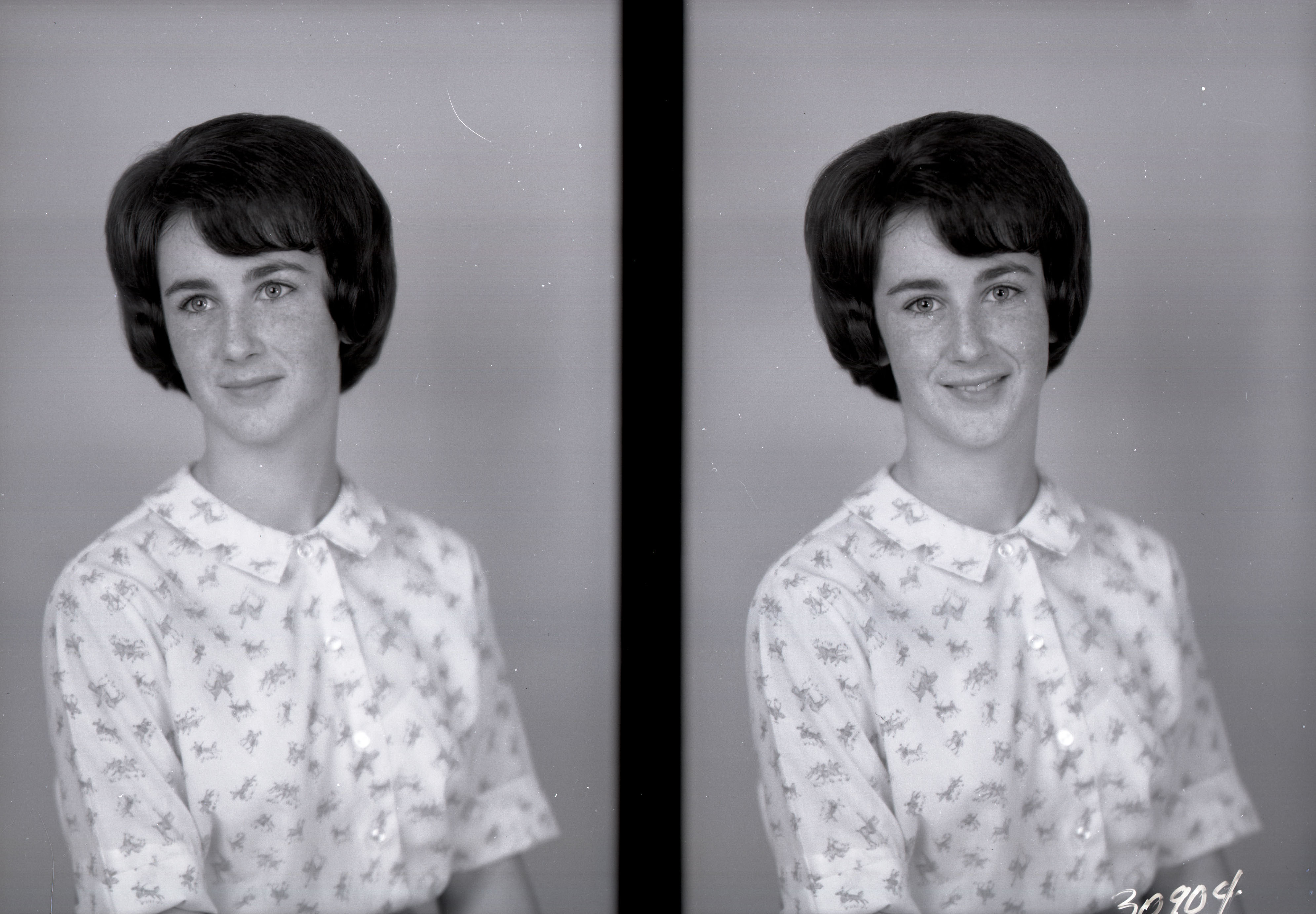Photo of two separate portrait photographs of the same unidentified young woman with short hair and wearing a short-sleeved print blouse.