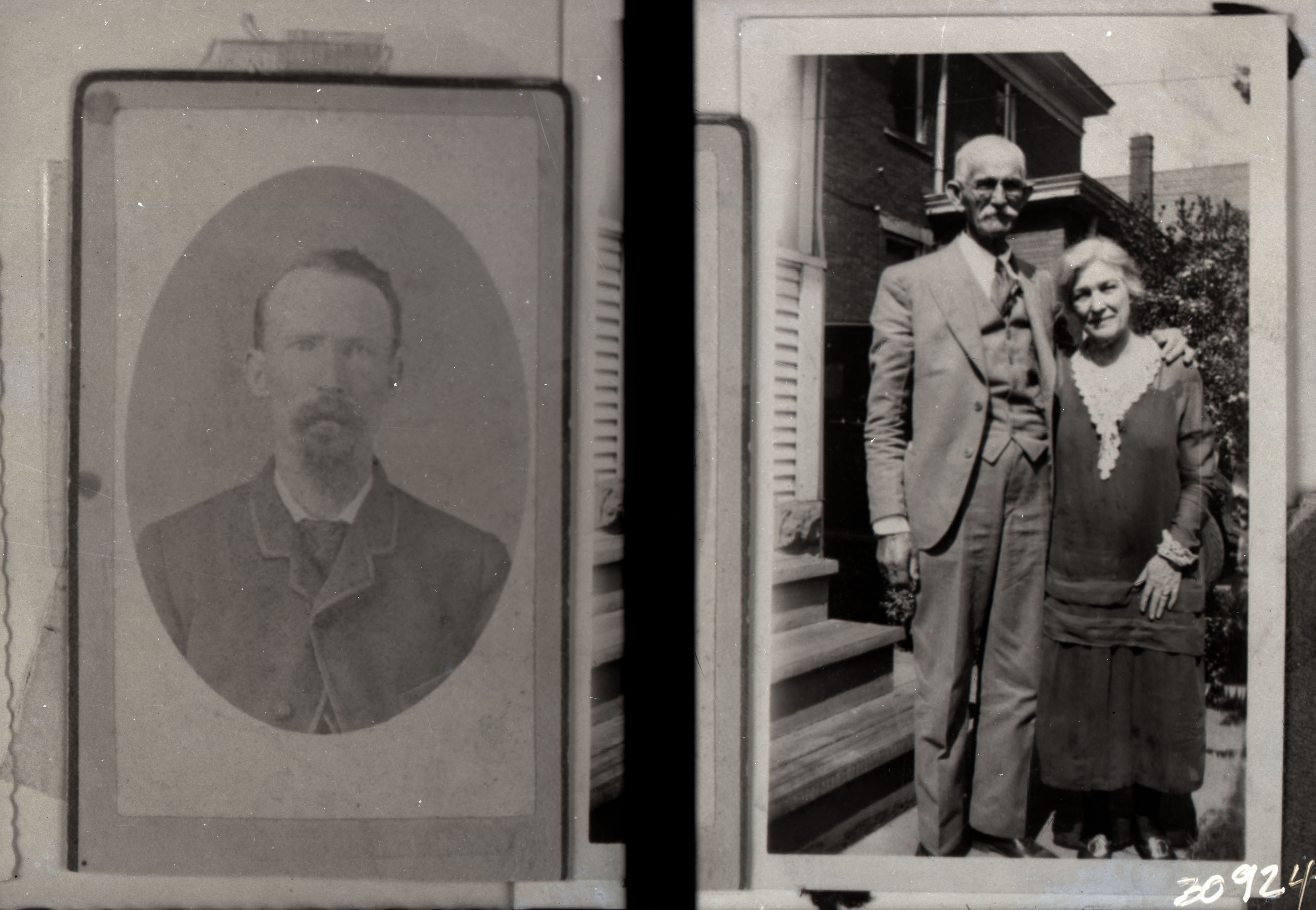 On the right is an unidentified man and woman standing together outside of a house. Probably, this was a husband and wife.